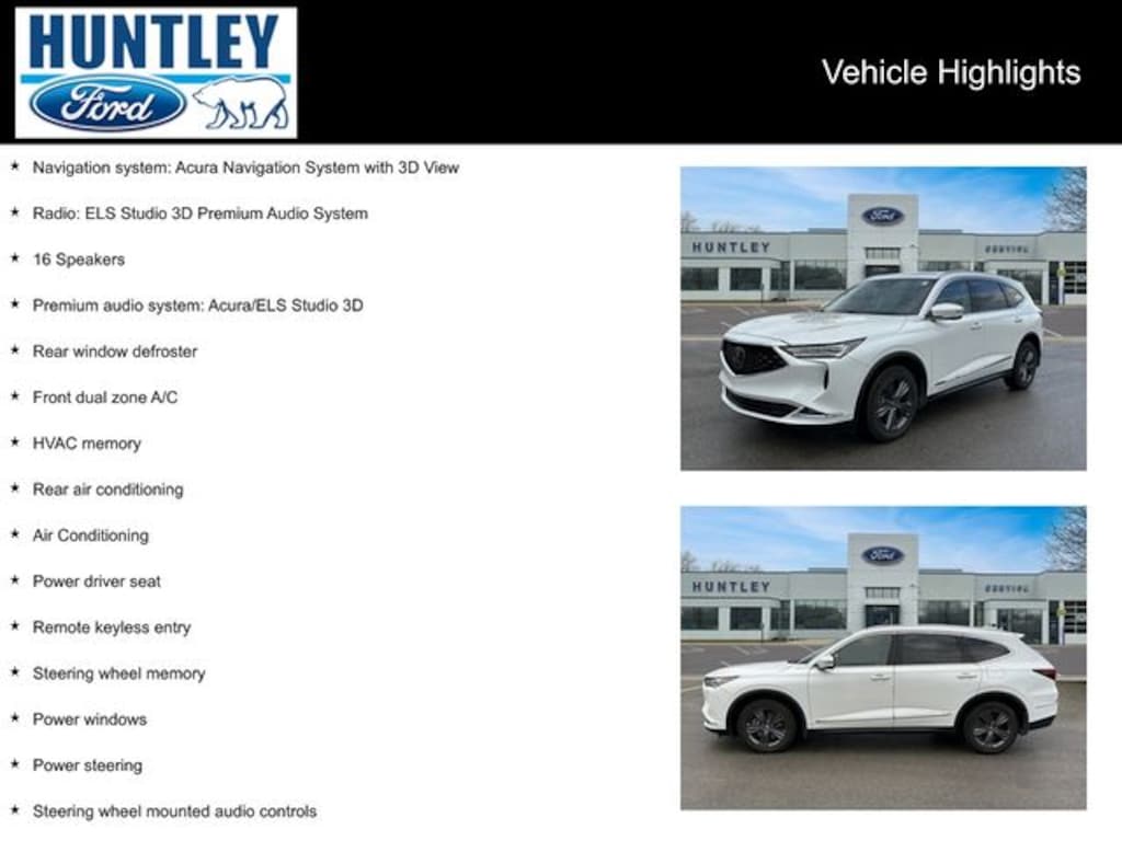 2022 Acura MDX Espresso Leather, 16 Speakers, Air Conditioning, Front dual zone A/C, HVAC memory, Navigation system: Acura Navigation System with 3D View, Power driver seat, Power Liftgate, Power moonroof, Power steering, Power windows, Premium audio system: Acura/ELS Studio 3D, Radio: ELS Studio 3D Premium Audio System, Rear air conditioning, Rear window defroster, Remote keyless entry, Steering wheel memory, Steering wheel mounted audio controls, Wheels: 20" x 9" Aluminum Alloy.