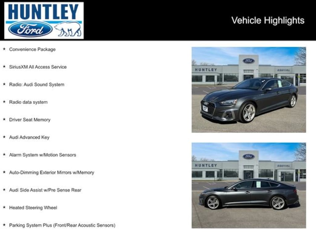 2022 Audi A5 Sportback Alarm System w/Motion Sensors, Audi Advanced Key, Audi Side Assist w/Pre Sense Rear, Auto-Dimming Exterior Mirrors w/Memory, Convenience Package, Driver Seat Memory, Heated Steering Wheel, Parking System Plus (Front/Rear Acoustic Sensors), Radio data system, Radio: Audi Sound System, SiriusXM All Access Service. Clean CARFAX.