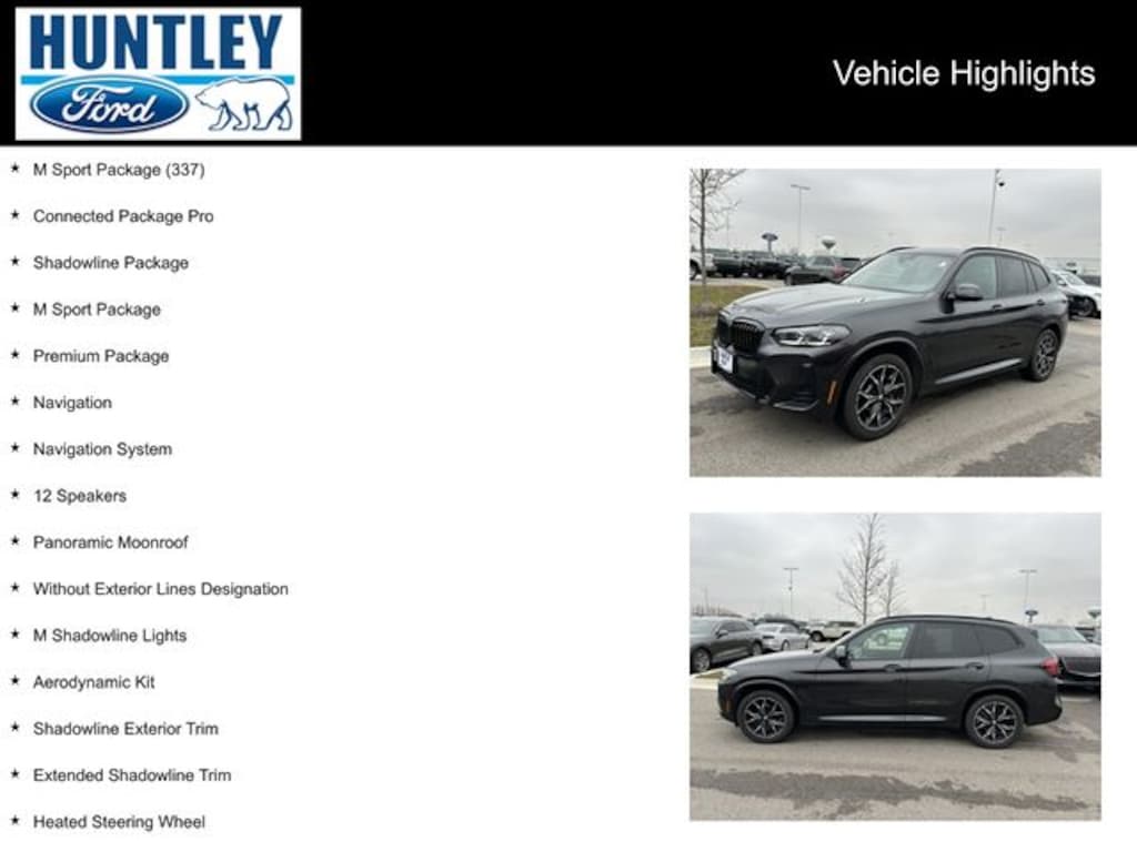 2023 BMW X3 8-Speed Automatic Sport, 12 Speakers, Aerodynamic Kit, Connected Package Pro, Driver Lumbar Support, Extended Shadowline Trim, Heated Front Seats, Heated Steering Wheel, Live Cockpit Pro w/Navigation, M Shadowline Lights, M Sport Package, M Sport Package (337), M Steering Wheel, Navigation, Navigation System, Panoramic Moonroof, Premium Package, Roof Rails in High-Gloss Shadowline, Shadowline Exterior Trim, Shadowline Package, Smoke Grey Aluminum Rhombicle Trim, Wheels: 19" x 7.5" M Y-Spoke Bi-Color (Style 887M), Without Exterior Lines Designation. CARFAX One-Owner.