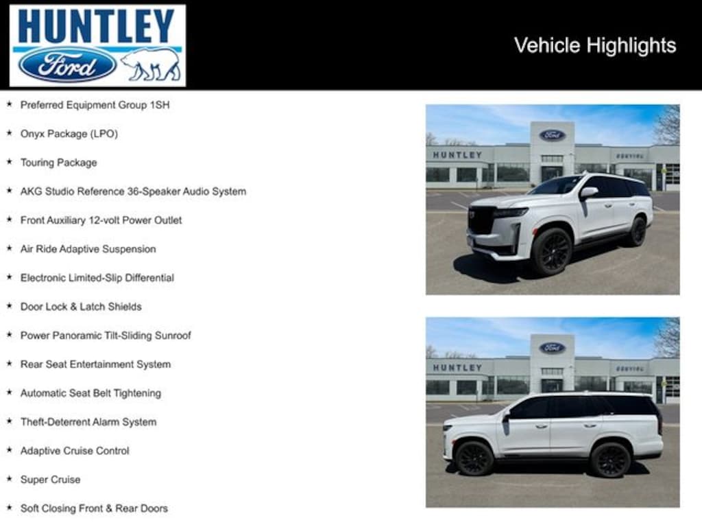 2023 Cadillac Escalade AWD, platinum Leather, Adaptive Cruise Control, Air Ride Adaptive Suspension, AKG Studio Reference 36-Speaker Audio System, Automatic Seat Belt Tightening, Body-Color Door Handles, Door Lock & Latch Shields, Electronic Limited-Slip Differential, Enhanced Automatic Emergency Braking, Enhanced Automatic Parking Assist, Floor Console w/Covered Storage, Front Auxiliary 12-volt Power Outlet, Glass Breakage Sensor, Gloss Black Escalade Nameplate (LPO), Heated & Ventilated Driver & Front Passenger Seats, Hitch Guidance w/Hitch View, Illuminating Front & Rear Sill Plates, Integrated Trailer Brake Controller, Monochrome Cadillac Emblems (LPO), Night Vision, Onyx Package (LPO), Platinum Interior Trim, Power Lumbar Massage Driver Seat, Power Lumbar Massage Front Passenger Seat, Power Panoramic Tilt-Sliding Sunroof, Preferred Equipment Group 1SH, Rear Camera Mirror, Rear Camera Mirror Washer, Rear Cross Traffic Alert, Rear Seat Entertainment System, Reconfigurable Full-Color Head-Up Display, Reverse Automatic Braking, Running Board Assist Steps, Smart Trailer Integration Indicator, Soft Closing Front & Rear Doors, Super Cruise, Theft-Deterrent Alarm System, Touring Package, Trailer Side Blind Zone Alert, Vehicle Inclination Sensor, Vehicle Interior Movement Sensor, Wheels: 22" 12-Spoke Gloss Black Alloy (LPO).