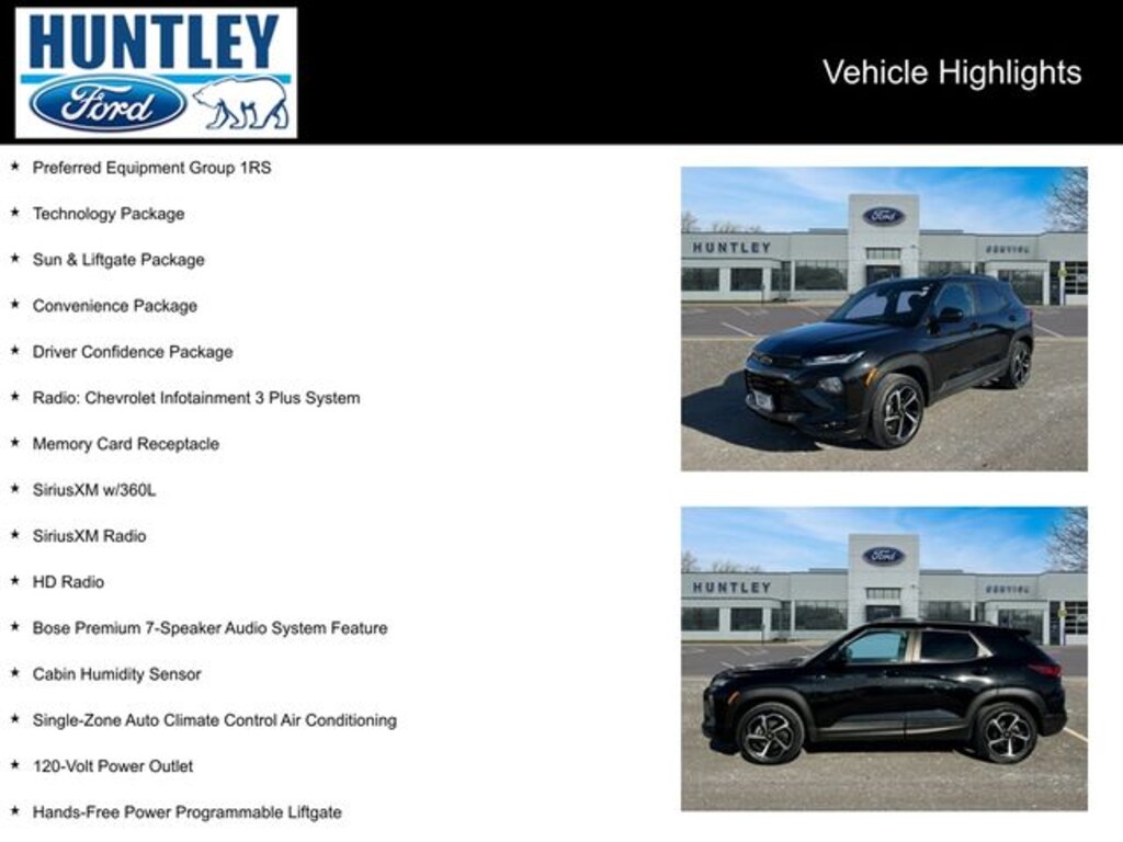 2021 Chevrolet TrailBlazer 1 Type-A & 1 Type-C USB Charging-Only Ports, 120-Volt Power Outlet, 4.2" Diagonal Multi-Color Driver Info Center, 8" Diagonal Color Touchscreen Display, Adaptive Cruise Control, Bose Premium 7-Speaker Audio System Feature, Cabin Humidity Sensor, Convenience Package, Driver & Front Passenger Illuminated Vanity Mirrors, Driver Confidence Package, Dual-Pane Panoramic Power Sunroof, Hands-Free Power Programmable Liftgate, HD Radio, HD Rear Vision Camera, Inside Rear-View Auto-Dimming Mirror, Lane Change Alert w/Side Blind Zone Alert, LED Headlamps, Memory Card Receptacle, Preferred Equipment Group 1RS, Radio: Chevrolet Infotainment 3 Plus System, Rear Cross Traffic Alert, Rear Park Assist, Single-Zone Auto Climate Control Air Conditioning, SiriusXM Radio, SiriusXM w/360L, Sun & Liftgate Package, Technology Package, Wireless Charging. Clean CARFAX. CARFAX One-Owner.