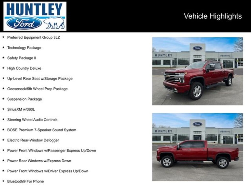 2022 Chevrolet Silverado 2500HD 10-Speed Automatic, 4WD, Jet Black Leather, 12-Volt Rear Auxiliary Power Outlet, 120-Volt Bed Mounted Power Outlet, 120-Volt Instrument Panel Power Outlet, 15" Diagonal Multicolor Head-Up Display, 170 Amp Alternator, 6" Rectangular Chromed Tubular Assist Steps, 8" Driver Information Center, Advanced Trailering System, Auto-Dimming Inside Rear-View Mirror, Automatic Emergency Braking, Bed View Camera w/2 Trailer Camera Provisions, Black Chevytec Spray-On Bedliner w/Chevrolet Logo, Bluetooth® For Phone, BOSE Premium 7-Speaker Sound System, Chevrolet Connected Access Capable, Chrome Front Grille, Chrome Mirror Caps, Color-Keyed Carpeting Floor Covering, Compass, Deep-Tinted Glass, Dual Charge-Only USB Ports (2nd Row), Electric Rear-Window Defogger, Electrical Lock Control Steering Column, Electronic Cruise Control w/Set & Resume Speed, Following Distance Indicator, Forward Collision Alert, Front Carpeted Floor Mats, Front Chrome Recovery Hooks, Front LED Fog Lamps, Gooseneck/5th Wheel Prep Package, HD Surround Vision w/2 Trailer View Camera Provisions, Heated & Auto-Dim Pwr Vertical Trailering Mirrors, Heated Steering Wheel, High Country Deluxe, Hitch Guidance w/Hitch View, Integrated Trailer Brake Controller, IntelliBeam Automatic High Beam On/Off, Keyless Open & Start, Lane Change Alert w/Side Blind Zone Alert, Lane Departure Warning System, Leather-Wrapped Steering Wheel, LED Cargo Area Lighting, Manual Tilt & Telescoping Steering Column, OnStar & Chevrolet Connected Services Capable, Polished Exhaust Tip, Power Door Locks, Power Front Windows w/Driver Express Up/Down, Power Front Windows w/Passenger Express Up/Down, Power Rear Windows w/Express Down, Power Sliding Rear Window w/Defogger, Power Sunroof, Preferred Equipment Group 3LZ, Rear Camera Mirror, Rear Carpeted Floor Mats, Rear Cross Traffic Alert, Rear Wheelhouse Liners, Remote Vehicle Starter System, Safety Alert Seat, Safety Package II, SiriusXM w/360L, Standard Tailgate, Steering Wheel Audio Controls, Suspension Package, Technology Package, Ultrasonic Front & Rear Park Assist, Unauthorized Entry Theft-Deterrent System, Universal Home Remote, Up-Level Rear Seat w/Storage Package, Wi-Fi Hotspot Capable, Wireless Charging, Wireless Phone Projection. Clean CARFAX.