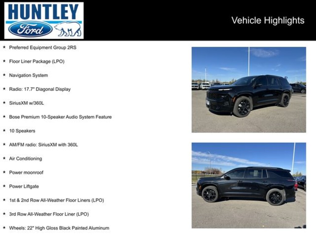2024 Chevrolet Traverse AWD, 10 Speakers, 1st & 2nd Row All-Weather Floor Liners (LPO), 3rd Row All-Weather Floor Liner (LPO), Air Conditioning, AM/FM radio: SiriusXM with 360L, Bose Premium 10-Speaker Audio System Feature, Floor Liner Package (LPO), Navigation System, Power Liftgate, Power moonroof, Preferred Equipment Group 2RS, Radio: 17.7" Diagonal Display, SiriusXM w/360L, Wheels: 22" High Gloss Black Painted Aluminum. Clean CARFAX.