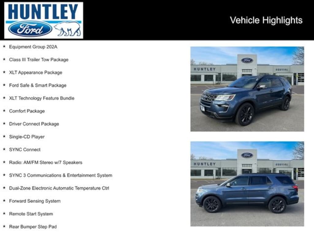 2018 Ford Explorer 4WD, 2 Driver Configurable 4.2" Color LCD Displays, Adaptive Cruise Control & Fwd Collision Warning, Auto High-Beam Headlights, Auto-Dimming Rear-View Mirror, Black Roof Rack Side Rails, BLIS Blind Spot Information System, Class III Trailer Tow Package, Comfort Package, Driver Connect Package, Dual-Zone Electronic Automatic Temperature Ctrl, Ebony Black Unique Door-Trim Panel Insert, Equipment Group 202A, EXPLORER Badge on Hood, EXPLORER Unique Branded Front Floor Mats, Ford Safe & Smart Package, Forward Sensing System, Heated Steering Wheel, Lane-Keeping System, Leather Heated Bucket Seats, Leather-Trimmed Bucket Seats, LED Fog Lamps, Lower Bodyside Cladding Insert, Lower Door Trim, Lower Front & Rear Bumper Covers, Magnetic Met-Painted Grille Bars w/Mesh Insert, Power & Heated Glass Sideview Mirrors, Power Liftgate, Radio: AM/FM Stereo w/7 Speakers, Rain-Sensing Wipers (Front Only), Rear Bumper Step Pad, Remote Start System, Sideview Mirror Caps, Single-CD Player, SYNC 3 Communications & Entertainment System, SYNC Connect, Twin Panel Moonroof, Universal Garage Door Opener (UGDO), Voice-Activated Touchscreen Navigation System, Wheels: 20" x 8.5" Magnetic Met Painted 10-Spoke, XLT Appearance Package, XLT Technology Feature Bundle. CARFAX One-Owner.