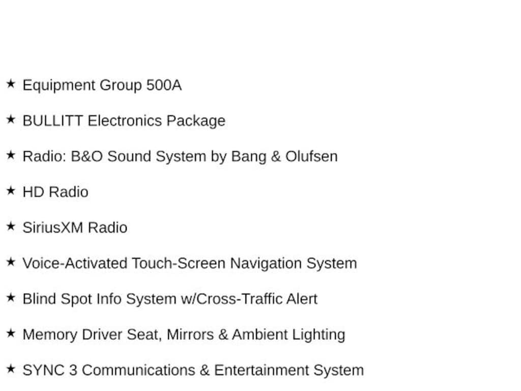 2019 Ford Mustang 6-Speed Manual Blind Spot Info System w/Cross-Traffic Alert, BULLITT Electronics Package, Equipment Group 500A, HD Radio, Memory Driver Seat, Mirrors & Ambient Lighting, Radio: B&O Sound System by Bang & Olufsen, SiriusXM Radio, SYNC 3 Communications & Entertainment System, Voice-Activated Touch-Screen Navigation System. 5.0L V8 Ti-VCT