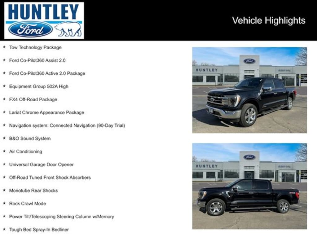 2021 Ford F-150 3.5L PowerBoost Full-Hybrid V6, 4WD, 2nd Row Heated Seats, 360 Degree Camera, 4x4 FX4 Off-Road Bodyside Decal, 6" Chrome Running Board, Active Park Assist 2.0, Air Conditioning, B&O Sound System, BlueCruise Hands-Free Driving, Chrome 2-Bar Grille w/4 Minor Bars, Chrome Door & Tailgate Handles w/Body-Color Bezel, Chrome Single-Tip Exhaust, Chrome Skull Caps on Exterior Mirrors, Connected Built-In Navigation, Equipment Group 502A High, Evasive Steering Assist, Ford Co-Pilot360 Active 2.0 Package, Ford Co-Pilot360 Assist 2.0, FX4 Off-Road Package, Heated Steering Wheel, Hill Descent Control, Integrated Trailer Brake Controller, Intelligent Adaptive Cruise Control w/Stop & Go, Intersection Assist, Lariat Chrome Appearance Package, Leather-Trimmed Bucket Seats, LED Projector w/Dynamic Bending Headlamps, Monotube Rear Shocks, Navigation system: Connected Navigation (90-Day Trial), Off-Road Tuned Front Shock Absorbers, Onboard 400W Outlet, Power Glass Sideview Mirr w/Chrome Skull Caps, Power Tailgate, Power Tilt/Telescoping Steering Column w/Memory, Pro Trailer Backup Assist, Rain-Sensing Wipers, Rock Crawl Mode, Speed Sign Recognition, Tough Bed Spray-In Bedliner, Tow Technology Package, Tray Style Floor Liner, Universal Garage Door Opener, Wheels: 20" Chrome-Like PVD. Clean CARFAX. CARFAX One-Owner.