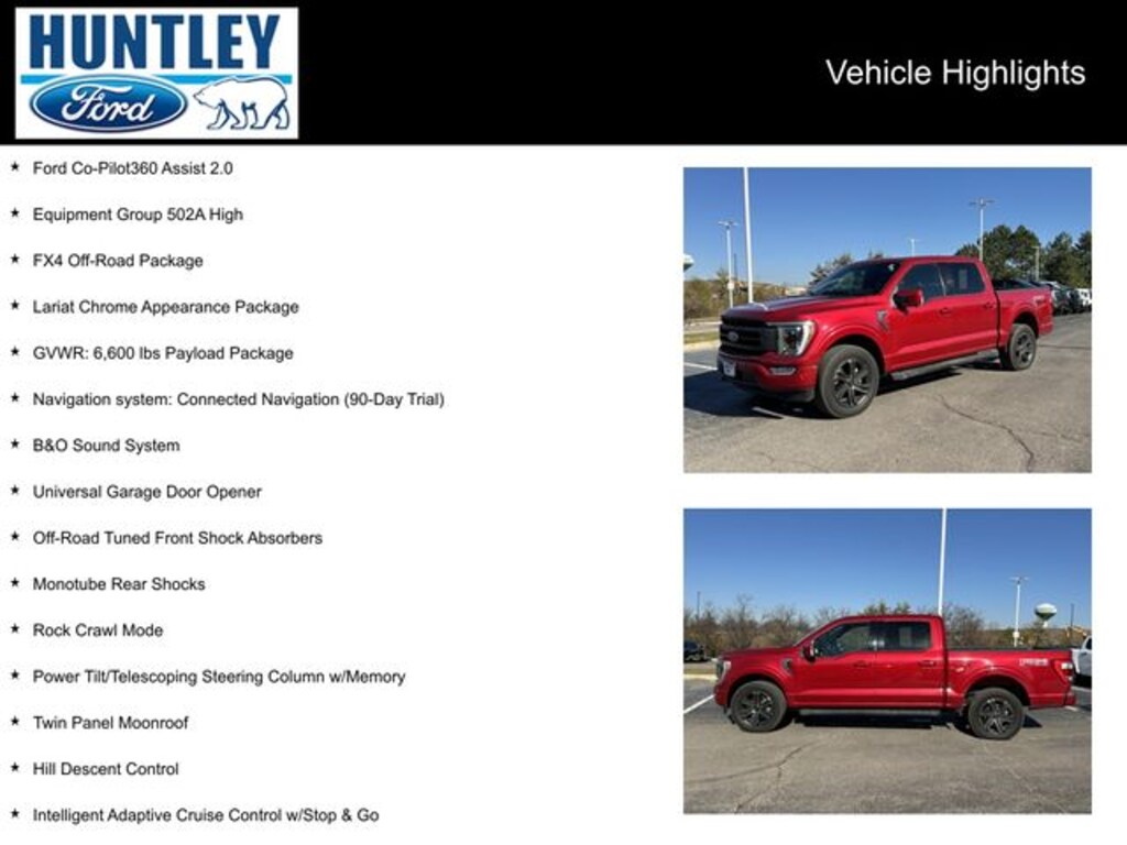 2021 Ford F-150 4WD, 2nd Row Heated Seats, 4x4 FX4 Off-Road Bodyside Decal, 6" Chrome Running Board, B&O Sound System, Chrome 2-Bar Grille w/4 Minor Bars, Chrome Door & Tailgate Handles w/Body-Color Bezel, Chrome Single-Tip Exhaust, Chrome Skull Caps on Exterior Mirrors, Connected Built-In Navigation, Electronic Locking w/3.55 Axle Ratio, Equipment Group 502A High, Evasive Steering Assist, Ford Co-Pilot360 Assist 2.0, FX4 Off-Road Package, GVWR: 6,600 lbs Payload Package, Heated Steering Wheel, Hill Descent Control, Intelligent Adaptive Cruise Control w/Stop & Go, Intersection Assist, Lariat Chrome Appearance Package, Leather-Trimmed Bucket Seats, LED Projector w/Dynamic Bending Headlamps, Monotube Rear Shocks, Navigation system: Connected Navigation (90-Day Trial), Off-Road Tuned Front Shock Absorbers, Onboard 400W Outlet, Power Glass Sideview Mirr w/Chrome Skull Caps, Power Tilt/Telescoping Steering Column w/Memory, Rain-Sensing Wipers, Rock Crawl Mode, Speed Sign Recognition, Tray Style Floor Liner, Twin Panel Moonroof, Universal Garage Door Opener, Wheels: 20" 6-Spoke Dark Alloy Painted Aluminum. CARFAX One-Owner.