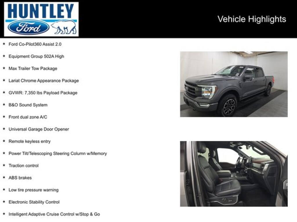 2021 Ford F-150 3.5L PowerBoost Full-Hybrid V6, 4WD, 2nd Row Heated Seats, 6" Chrome Running Board, ABS brakes, Alloy wheels, B&O Sound System, Chrome 2-Bar Grille w/4 Minor Bars, Chrome Door & Tailgate Handles w/Body-Color Bezel, Chrome Single-Tip Exhaust, Chrome Skull Caps on Exterior Mirrors, Class IV Trailer Hitch Receiver, Compass, Connected Built-In Navigation, Electronic Locking w/3.73 Axle Ratio, Electronic Stability Control, Equipment Group 502A High, Evasive Steering Assist, Extended Range 36 Gallon Fuel Tank, Ford Co-Pilot360 Assist 2.0, Front dual zone A/C, GVWR: 7,350 lbs Payload Package, Heated door mirrors, Heated front seats, Heated Steering Wheel, Illuminated entry, Integrated Trailer Brake Controller, Intelligent Adaptive Cruise Control w/Stop & Go, Intersection Assist, Lariat Chrome Appearance Package, Leather-Trimmed Bucket Seats, LED Projector w/Dynamic Bending Headlamps, Low tire pressure warning, Max Trailer Tow Package, Onboard 400W Outlet, Power Glass Sideview Mirr w/Chrome Skull Caps, Power Tilt/Telescoping Steering Column w/Memory, Pro Trailer Backup Assist, Rain-Sensing Wipers, Remote keyless entry, Speed Sign Recognition, Traction control, Universal Garage Door Opener, Wheels: 18" Chrome-Like PVD.