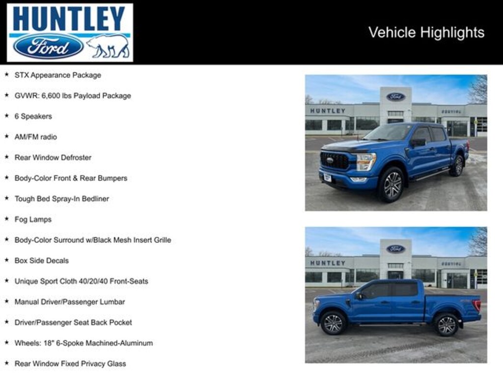 2021 Ford F-150 4WD, 6 Speakers, AM/FM radio, Body-Color Front & Rear Bumpers, Body-Color Surround w/Black Mesh Insert Grille, Box Side Decals, Driver/Passenger Seat Back Pocket, Electronic Locking w/3.55 Axle Ratio, Fog Lamps, GVWR: 6,600 lbs Payload Package, Manual Driver/Passenger Lumbar, Rear Window Defroster, Rear Window Fixed Privacy Glass, STX Appearance Package, Tough Bed Spray-In Bedliner, Unique Sport Cloth 40/20/40 Front-Seats, Wheels: 18" 6-Spoke Machined-Aluminum. Clean CARFAX.