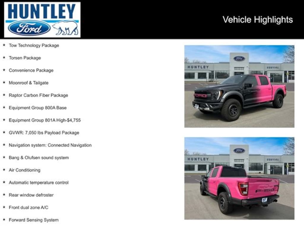 2022 Ford F-150 4WD, 360 Degree Camera, Air Conditioning, Auto Start-Stop Removal, Automatic temperature control, Bang & Olufsen sound system, Connected Built-In Navigation, Convenience Package, Electronic Locking w/4.10 Axle Ratio, Equipment Group 800A Base, Equipment Group 801A High-$4,755, Forward Sensing System, Front dual zone A/C, Front-Axle w/Torsen Differential, GVWR: 7,050 lbs Payload Package, Heated Steering Wheel, Integrated Trailer Brake Controller, Interior Work Surface, Leather Trim Seats w/Heated 2nd Row, LED Projector w/Dynamic Bending Headlamps, Moonroof & Tailgate, Navigation system: Connected Navigation, Partitioned Lockable Fold-Flat Storage, Power driver seat, Power steering, Power Tailgate, Power Tilt/Telescoping Steering Column w/Memory, Power windows, Pro Trailer Backup Assist, Rain-Sensing Wipers, Raptor Carbon Fiber Package, Rear window defroster, Remote keyless entry, Rigid LED Fog Lamp, Steering wheel mounted audio controls, SYNC 4 w/Enhanced Voice Recognition, Tailgate Applique FORD, Torsen Package, Tow Technology Package, Twin Panel Moonroof, Universal Garage Door Opener, Wheels: Unique 17" Forged Aluminum Bead-Lock Capable, Wireless Charging Pad. Clean CARFAX.