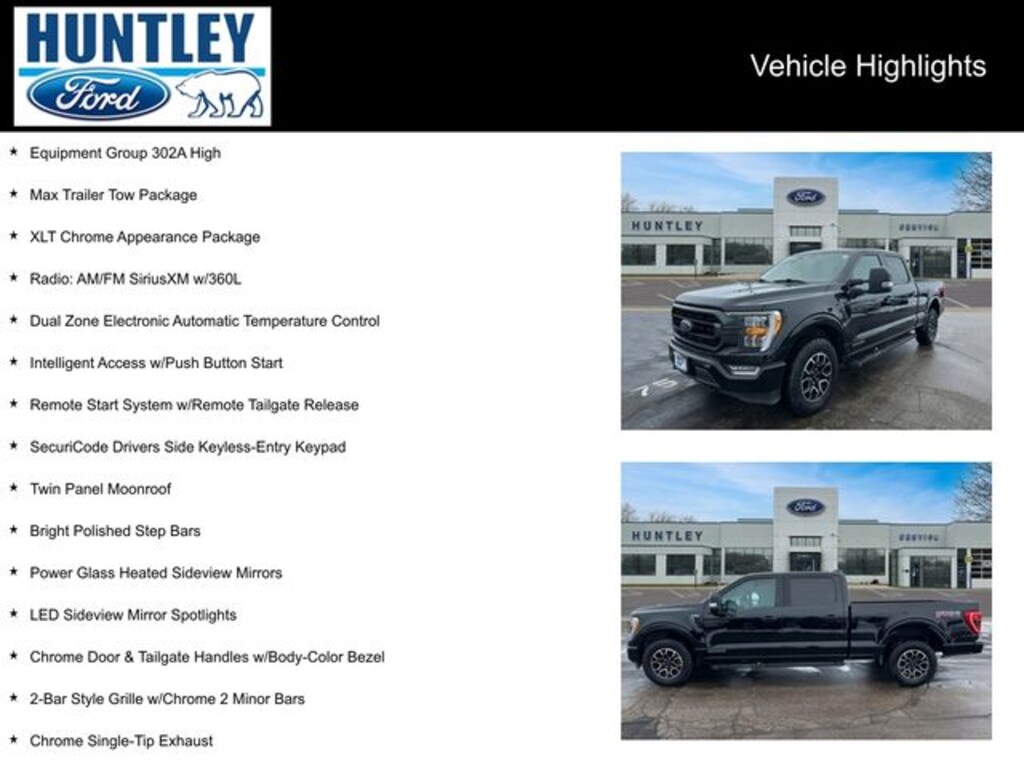 2022 Ford F-150 3.5L PowerBoost Full-Hybrid V6, 4WD, 10-Way Power Driver & Passenger Seats, 2-Bar Style Grille w/Chrome 2 Minor Bars, 8" Productivity Screen in Instrument Cluster, Auto-Dimming Rear-View Mirror, Bright Polished Step Bars, Chrome Door & Tailgate Handles w/Body-Color Bezel, Chrome Single-Tip Exhaust, Class IV Trailer Hitch Receiver, Dual Zone Electronic Automatic Temperature Control, Electronic Locking w/3.73 Axle Ratio, Equipment Group 302A High, Extended Range 36 Gallon Fuel Tank, Heated Front Seats, Integrated Trailer Brake Controller, Intelligent Access w/Push Button Start, Leather-Wrapped Steering Wheel, LED Reflector Headlamps, LED Sideview Mirror Spotlights, Max Trailer Tow Package, Onboard 400W Outlet, Power Glass Heated Sideview Mirrors, Pro Power Onboard - 7.2KW, Pro Trailer Backup Assist, Radio: AM/FM SiriusXM w/360L, Rear Under-Seat Storage, Remote Start System w/Remote Tailgate Release, SecuriCode Drivers Side Keyless-Entry Keypad, SYNC 4 w/Enhanced Voice Recognition, Twin Panel Moonroof, Wheels: 18" Chrome-Like PVD, XLT Chrome Appearance Package, Zone Lighting. Clean CARFAX.