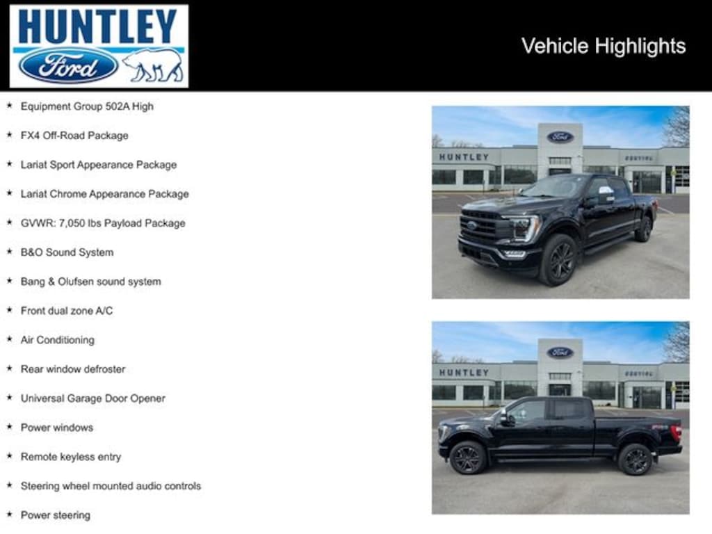 2022 Ford F-150 4WD, 2nd Row Heated Seats, 4x4 FX4 Off-Road Bodyside Decal, 6" Bright Polished Running Board, Accent-Color Angular Step Bars, Air Conditioning, Alloy wheels, B&O Sound System, Bang & Olufsen sound system, Body-Color Front & Rear Bumpers, Box Side Decals, Chrome 2-Bar Grille w/4 Minor Bars, Chrome Door & Tailgate Handles w/Body-Color Bezel, Chrome Single-Tip Exhaust, Chrome Skull Caps on Exterior Mirrors, Class IV Trailer Hitch Receiver, Dark 2-Bar & 1 Minor Bar Style Grille, Electronic Locking w/3.55 Axle Ratio, Equipment Group 502A High, Front dual zone A/C, FX4 Off-Road Package, GVWR: 7,050 lbs Payload Package, Heated Steering Wheel, Hill Descent Control, Lariat Chrome Appearance Package, Lariat Sport Appearance Package, Leather-Trimmed Bucket Seats, LED Projector w/Dynamic Bending Headlamps, Monotube Rear Shocks, Off-Road Tuned Front Shock Absorbers, Onboard 400W Outlet, Power Glass Sideview Mirr w/Chrome Skull Caps, Power steering, Power Tilt/Telescoping Steering Column w/Memory, Power windows, Rain-Sensing Wipers, Rear window defroster, Remote keyless entry, Rock Crawl Mode, Steering wheel mounted audio controls, Tray Style Floor Liner (47W), Twin Panel Moonroof, Universal Garage Door Opener, Wheels: 20" 6-Spoke Dark Alloy Painted Aluminum, Wireless Charging Pad. Clean CARFAX.