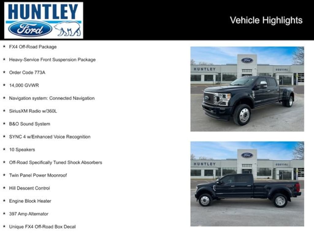 2022 Ford F-450SD 4WD, 10 Speakers, 14,000 GVWR, 397 Amp Alternator, B&O Sound System, Engine Block Heater, FX4 Off-Road Package, Heavy-Service Front Suspension Package, Hill Descent Control, Individual Trailer TPMS w/Camera (Pre-Installed), Navigation system: Connected Navigation, Off-Road Specifically Tuned Shock Absorbers, Order Code 773A, SiriusXM Radio w/360L, SYNC 4 w/Enhanced Voice Recognition, Twin Panel Power Moonroof, Unique FX4 Off-Road Box Decal.
