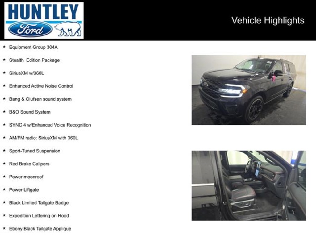 2023 Ford Expedition Max 1st & 2nd Row Floor Mats w/Logo, 3.73 Axle Ratio, AM/FM radio: SiriusXM with 360L, B&O Sound System, Bang & Olufsen sound system, Black Headlamp and Fog Lamp Bezels, Black Limited Tailgate Badge, Black Roof Rack Side Rails, Body Color Door Handles, Dual Exhaust System, Ebony Black Bar and Mesh Grille, Ebony Black Power Deployable Running Boards, Ebony Black Tailgate Applique, Enhanced Active Noise Control, Equipment Group 304A, Expedition Lettering on Hood, Heated/Ventilated Lthr Front Captain's Chairs (A), LED Taillamp w/Black Bezels, Power Liftgate, Power moonroof, Power-Folding Sideview Mirrors w/Autofold, Red Brake Calipers, SiriusXM w/360L, Sport Center Console, Sport-Tuned Suspension, Stealth Edition Package, SYNC 4 w/Enhanced Voice Recognition, Wheels: 22" Premium Black-Painted Aluminum. Clean CARFAX.