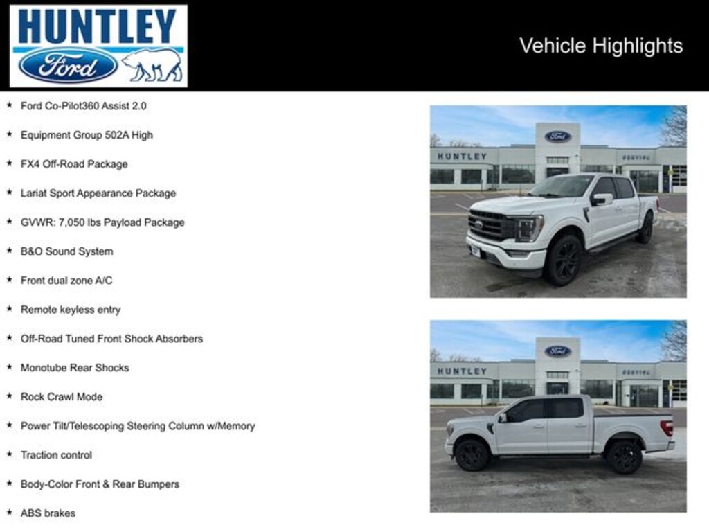 2023 Ford F-150 4WD, 2nd Row Heated Seats, 4x4 FX4 Off-Road Bodyside Decal, ABS brakes, Accent-Color Angular Step Bars, Alloy wheels, B&O Sound System, Body-Color Front & Rear Bumpers, Box Side Decals, Chrome Single-Tip Exhaust, Compass, Connected Built-In Navigation, Dark 2-Bar & 1 Minor Bar Style Grille, Electronic Locking w/3.31 Axle Ratio, Electronic Stability Control, Equipment Group 502A High, Evasive Steering Assist, Ford Co-Pilot360 Assist 2.0, Front dual zone A/C, FX4 Off-Road Package, GVWR: 7,050 lbs Payload Package, Heated door mirrors, Heated front seats, Hill Descent Control, Illuminated entry, Intelligent Adaptive Cruise Control w/Stop & Go, Intersection Assist, Lariat Sport Appearance Package, LED Projector w/Dynamic Bending Headlamps, Low tire pressure warning, Monotube Rear Shocks, Off-Road Tuned Front Shock Absorbers, Power Tilt/Telescoping Steering Column w/Memory, Rain-Sensing Wipers, Remote keyless entry, Rock Crawl Mode, Speed Sign Recognition, SYNC 4 w/Enhanced Voice Recognition, Traction control, Wheels: 20" Chrome-Like PVD, Wireless Charging Pad. Clean CARFAX.