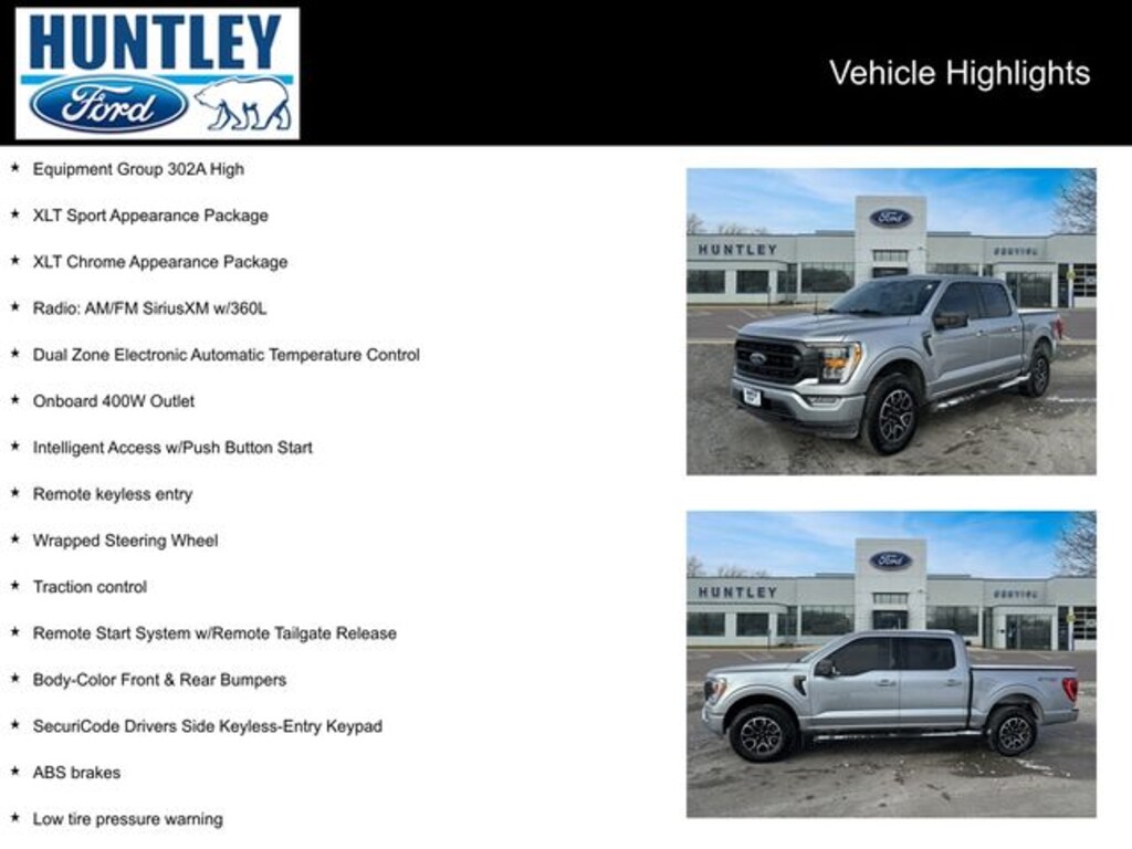 2023 Ford F-150 4WD, 10-Way Power Driver & Passenger Seats, 2-Bar Style Grille w/Chrome 2 Minor Bars, 6" Extended Dark Gray Accent Running Board, 8" Productivity Screen in Instrument Cluster, ABS brakes, Accent-Color Step Bars, Alloy wheels, Auto-Dimming Rear-View Mirror, Black 2-Bar Style Grille w/Black Surround/Accents, Body-Color Door & Tailgate Handles, Body-Color Front & Rear Bumpers, Box Side Decals, Bright Polished Step Bars, Chrome Door & Tailgate Handles w/Body-Color Bezel, Chrome Single-Tip Exhaust, Class IV Trailer Hitch Receiver, Compass, Dual Zone Electronic Automatic Temperature Control, Electronic Stability Control, Equipment Group 302A High, Extended Range 36 Gallon Fuel Tank, Heated door mirrors, Heated Front Seats, Illuminated entry, Intelligent Access w/Push Button Start, LED Reflector Headlamps, LED Sideview Mirror Spotlights, Low tire pressure warning, Onboard 400W Outlet, Power Glass Heated Sideview Mirrors, Radio: AM/FM SiriusXM w/360L, Rear Under-Seat Storage, Remote keyless entry, Remote Start System w/Remote Tailgate Release, SecuriCode Drivers Side Keyless-Entry Keypad, SYNC 4 w/Enhanced Voice Recognition, Traction control, Unique Sport Cloth 40/Console/40 Front-Seats, Wheels: 18" 6-Spoke Machined Aluminum, Wheels: 18" Chrome-Like PVD, Wrapped Steering Wheel, XLT Chrome Appearance Package, XLT Sport Appearance Package, Zone Lighting.
