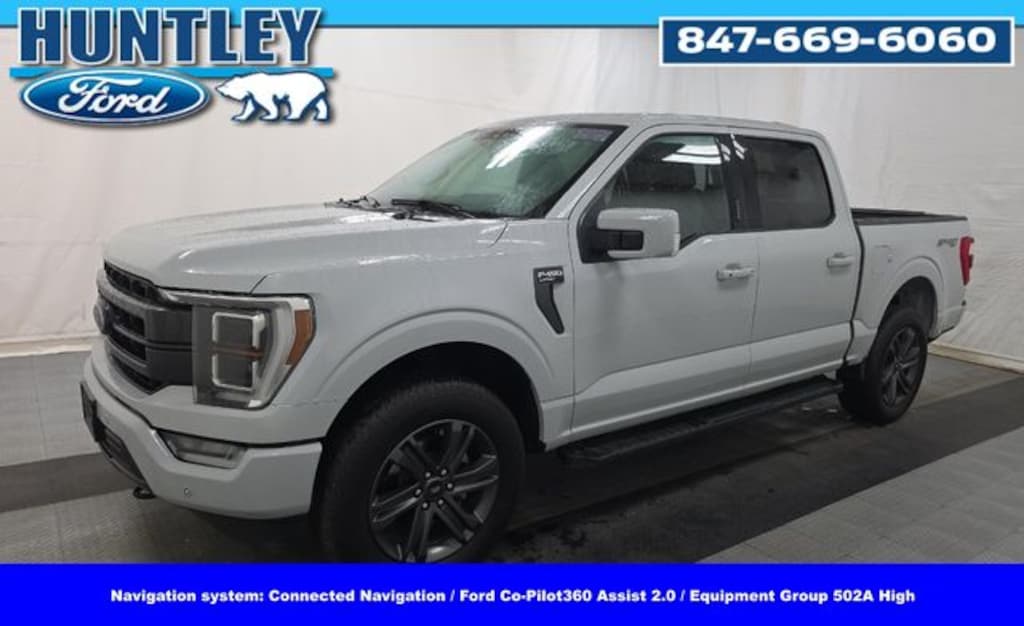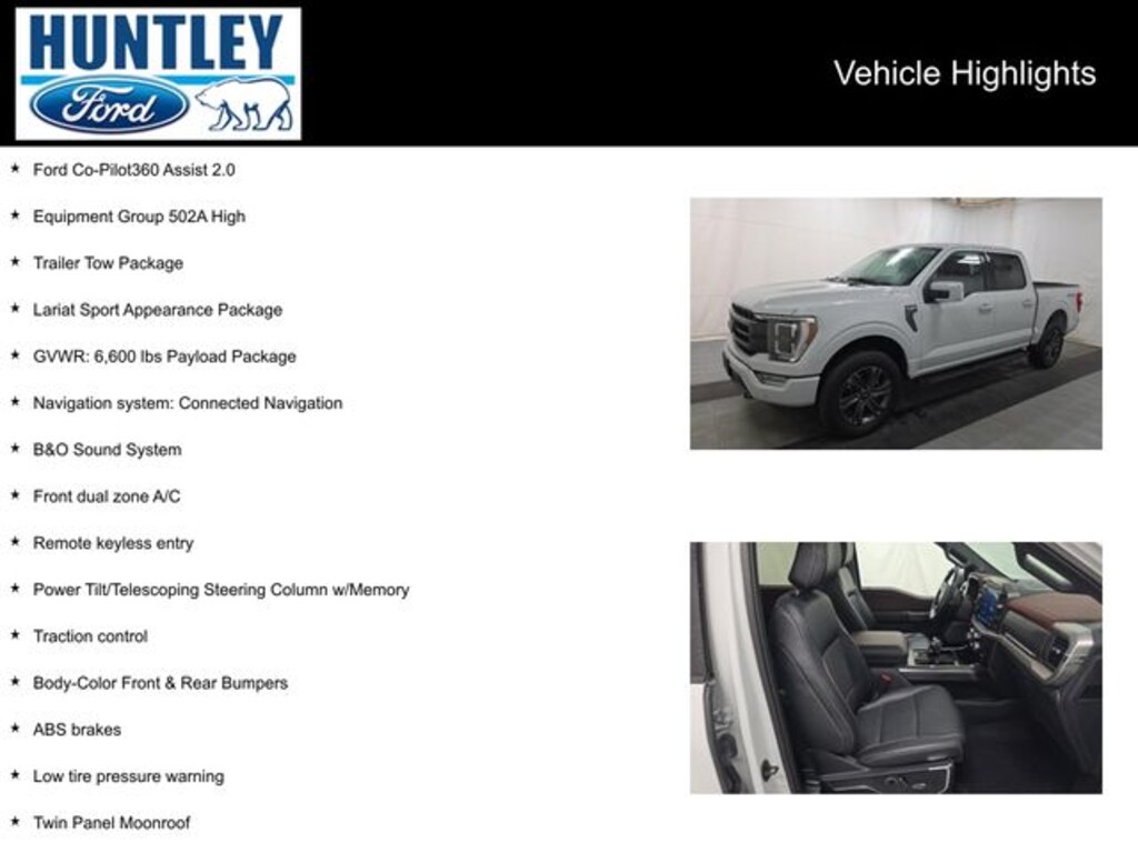 2023 Ford F-150 4WD, 2nd Row Heated Seats, 3.55 Axle Ratio, ABS brakes, Accent-Color Angular Step Bars, Alloy wheels, B&O Sound System, Body-Color Front & Rear Bumpers, Box Side Decals, Chrome Single-Tip Exhaust, Class IV Trailer Hitch Receiver, Compass, Connected Built-In Navigation, Dark 2-Bar & 1 Minor Bar Style Grille, Electronic Stability Control, Equipment Group 502A High, Evasive Steering Assist, Ford Co-Pilot360 Assist 2.0, Front dual zone A/C, GVWR: 6,600 lbs Payload Package, Heated door mirrors, Heated front seats, Illuminated entry, Integrated Trailer Brake Controller, Intelligent Adaptive Cruise Control w/Stop & Go, Intersection Assist, Lariat Sport Appearance Package, LED Projector w/Dynamic Bending Headlamps, Low tire pressure warning, Navigation system: Connected Navigation, Power Tilt/Telescoping Steering Column w/Memory, Pro Trailer Backup Assist & Pro Trailer Hitch Assist, Rain-Sensing Wipers, Remote keyless entry, Speed Sign Recognition, SYNC 4 w/Enhanced Voice Recognition, Traction control, Trailer Tow Package, Twin Panel Moonroof, Wheels: 20" 6-Spoke Dark Alloy Painted Aluminum, Wireless Charging Pad. Clean CARFAX.
