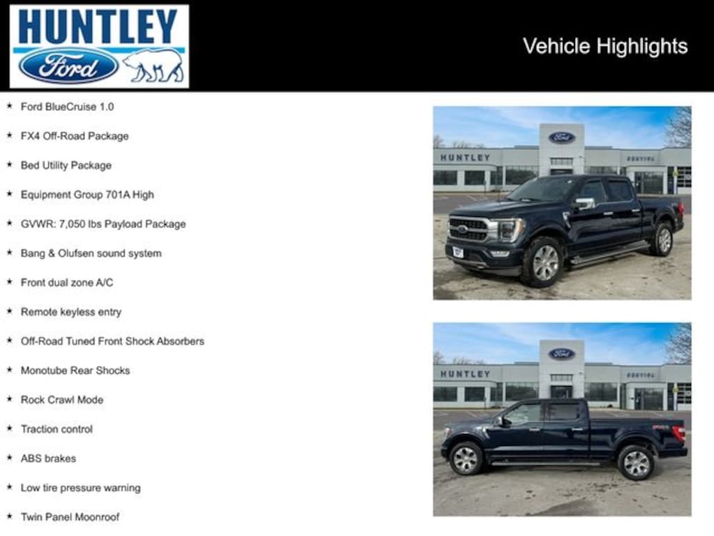 2023 Ford F-150 4WD, 360 Degree Camera, 4x4 FX4 Off-Road Bodyside Decal, ABS brakes, Active Park Assist 2.0, Alloy wheels, Bang & Olufsen sound system, Bed Utility Package, BoxLink, Compass, Electronic Locking w/3.31 Axle Ratio, Electronic Stability Control, Equipment Group 701A High, Extended Range 36 Gallon Fuel Tank, Ford BlueCruise 1.0, Front dual zone A/C, FX4 Off-Road Package, GVWR: 7,050 lbs Payload Package, Heated door mirrors, Heated front seats, Heated rear seats, Hill Descent Control, Illuminated entry, Integrated Trailer Brake Controller, LED Box Lighting, Low tire pressure warning, Monotube Rear Shocks, Off-Road Tuned Front Shock Absorbers, Power Tailgate, Pro Trailer Backup Assist & Pro Trailer Hitch Assist, Remote keyless entry, Rock Crawl Mode, Tailgate Step w/Tailgate Work Surface, Tough Bed Spray-In Bedliner, Traction control, Tray Style Floor Liner, Twin Panel Moonroof. Clean CARFAX.
