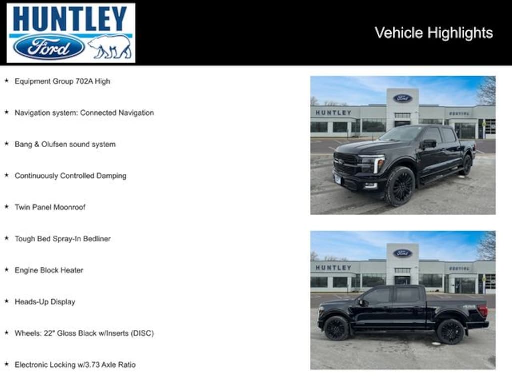 2024 Ford F-150 3.5L PowerBoost Full-Hybrid V6, 4WD, Bang & Olufsen sound system, Continuously Controlled Damping, Electronic Locking w/3.73 Axle Ratio, Engine Block Heater, Equipment Group 702A High, Heads-Up Display, Navigation system: Connected Navigation, Tough Bed Spray-In Bedliner, Twin Panel Moonroof, Wheels: 22" Gloss Black w/Inserts (DISC). Clean CARFAX.