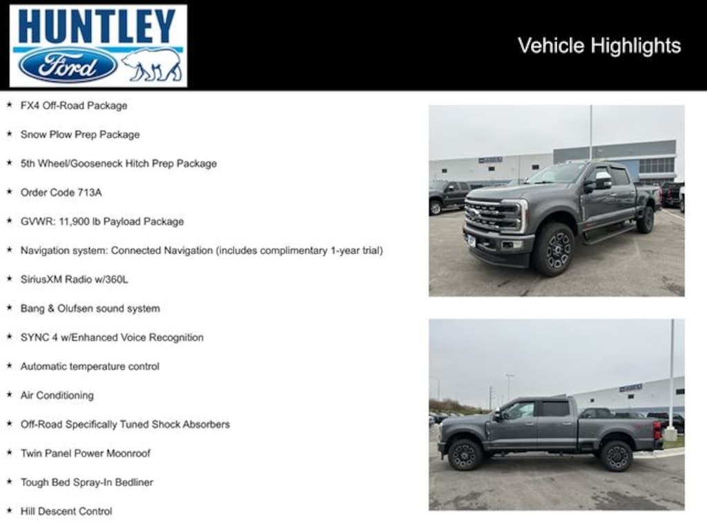 2024 Ford F-350SD 4WD, 5th Wheel/Gooseneck Hitch Prep Package, Air Conditioning, Automatic temperature control, Bang & Olufsen sound system, Electronic-Locking w/3.31 Axle Ratio, FX4 Off-Road Package, GVWR: 11,900 lb Payload Package, Heated door mirrors, Hill Descent Control, LED Roof Clearance Lights, Max Recline Seats, Navigation system: Connected Navigation (includes complimentary 1-year trial), Off-Road Specifically Tuned Shock Absorbers, Order Code 713A, SiriusXM Radio w/360L, Snow Plow Prep Package, SYNC 4 w/Enhanced Voice Recognition, Tough Bed Spray-In Bedliner, Twin Panel Power Moonroof, Unique FX4 Off-Road Box Decal. Clean CARFAX.