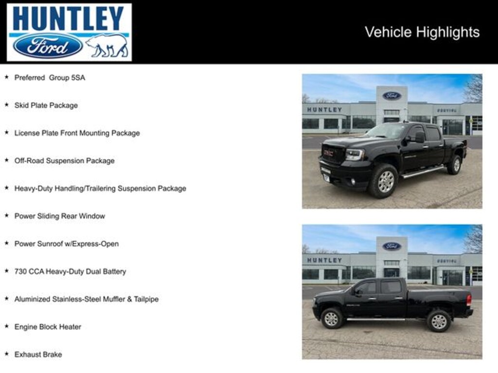2011 GMC Sierra 3500HD Duramax 6.6L V8 Turbodiesel, Allison 1000 6-Speed Automatic, 4WD, Ebony Leather, a 730 CCA Heavy-Duty Dual Battery for those cold mornings, Aluminized Stainless-Steel Muffler & Tailpipe, Engine Block Heater, Exhaust Brake, Heavy-Duty Handling/Trailering Suspension Package, License Plate Front Mounting Package, Off-Road Suspension Package, Power Sliding Rear Window, Power Sunroof w/Express-Open, Preferred Group 5SA, Skid Plate Package. Clean CARFAX.