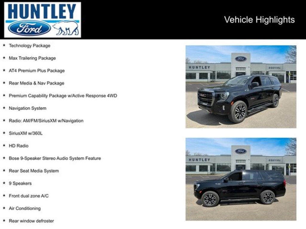 2021 GMC Yukon 4WD, 15" Diagonal Multi-Color Head-Up Display, 9 Speakers, Air Conditioning, Air Ride Adaptive Suspension, AT4 Premium Plus Package, Bose 9-Speaker Stereo Audio System Feature, Dual-Pane Panoramic Power Sunroof, Electronic Limited Slip Differential (eLSD), Extra Capacity Cooling System, Front dual zone A/C, HD Radio, HD Surround Vision, Max Trailering Package, Navigation System, Power driver seat, Power Liftgate, Power steering, Power windows, Power-Retractable Assist Steps, Premium Capability Package w/Active Response 4WD, Radio: AM/FM/SiriusXM w/Navigation, Rain sensing wipers, Rear air conditioning, Rear Media & Nav Package, Rear Pedestrian Alert, Rear Seat Media System, Rear window defroster, Rear window wiper, Remote keyless entry, SiriusXM w/360L, Steering wheel memory, Steering wheel mounted audio controls, Technology Package, Variably intermittent wipers, Wheels: 20" x 9" 6-Spoke Machined Aluminum. Clean CARFAX.