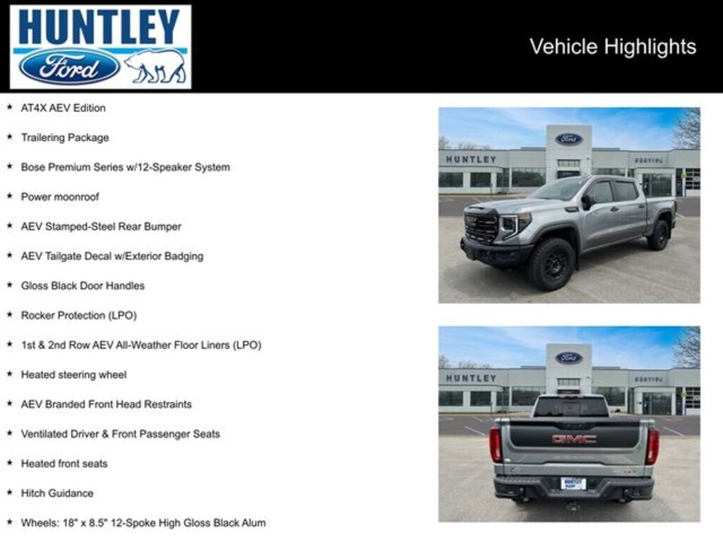 2023 GMC Sierra 1500 10-Speed Automatic, 4WD, Obsidian Rush w/Full Grain Leather Seat Trim, 1st & 2nd Row AEV All-Weather Floor Liners (LPO), AEV Branded Front Head Restraints, AEV Stamped-Steel Rear Bumper, AEV Tailgate Decal w/Exterior Badging, AT4X AEV Edition, Bose Premium Series w/12-Speaker System, Gloss Black Door Handles, Heated front seats, Heated steering wheel, Hitch Guidance, Power moonroof, Rocker Protection (LPO), Trailering Package, Ventilated Driver & Front Passenger Seats, Wheels: 18" x 8.5" 12-Spoke High Gloss Black Alum.