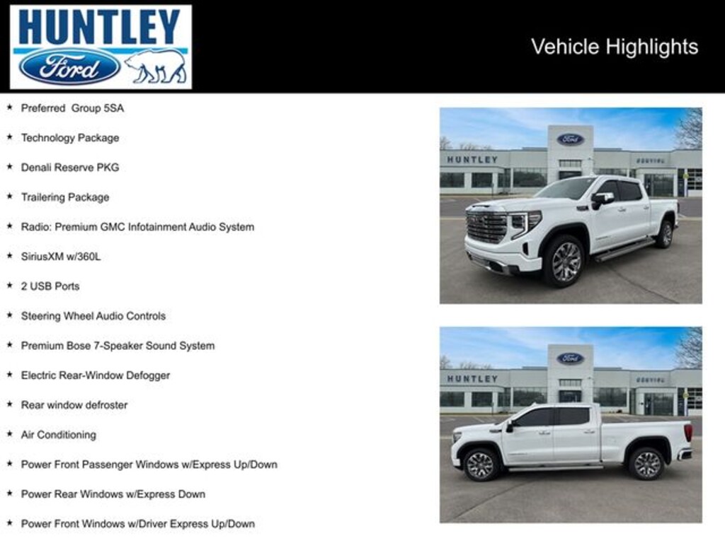 2023 GMC Sierra 1500 10-Speed Automatic, 4WD, Atmosphere/Brownstone Leather, 120-Volt Bed Mounted Power Outlet, 120-Volt Instrument Panel Power Outlet, 170 Amp Alternator, 2 Charge/Data USB Ports Inside Center Console, 2 Type-C Charge-Only Rear USB Ports, 2 USB Ports, Adaptive Cruise Control, Air Conditioning, Auto-Locking Rear Differential, Auxiliary External Transmission Oil Cooler, Bed View Camera, Bumpers: body-color, Cat-Back Performance Exhaust (LPO), Chrome Header w/Signature Denali Chrome Grille, Chrome Recovery Hooks, Chrome Wheel To Wheel Assist Steps, Color-Keyed Carpeting Floor Covering, Compass, Deep-Tinted Glass, Denali Reserve PKG, Electric Rear-Window Defogger, Electrical Steering Column Lock, Floor-Mounted Center Console, Front Rainsensing Wipers, GMC Connected Access Capable, GMC MultiPro Power Steps, HD Surround Vision, Heated 2nd Row Outboard Seats, Heated Driver & Front Outboard Passenger Seating, Heavy-Duty Air Filter, Hill Descent Control, Hitch Guidance, Hitch Guidance w/Hitch View, In-Vehicle Trailering App, Integrated Trailer Brake Controller, Keyless Open & Start, LED Cargo Area Lighting, Multicolor 15" Diagonal Head-Up Display, OnStar & GMC Connected Services Capable, Perimeter Lighting, Power Door Locks, Power Front Passenger Windows w/Express Up/Down, Power Front Windows w/Driver Express Up/Down, Power Rake & Telescoping Steering Column, Power Rear Windows w/Express Down, Power Sliding Rear Window w/Rear Defogger, Power steering, Power Sunroof, Power windows, Preferred Group 5SA, Premium Bose 7-Speaker Sound System, Push Button Start, Radio: Premium GMC Infotainment Audio System, Rear Camera Mirror, Rear Cross Traffic Braking, Rear Pedestrian Detection, Rear Wheelhouse Liners, Rear window defroster, Remote keyless entry, Remote Vehicle Starter System, SiriusXM w/360L, Spray-On Pickup Bed Liner w/Denali Logo, Steering Wheel Audio Controls, Technology Package, Theft Deterrent System (Unauthorized Entry), Trailer Camera Provisions, Trailer Side Blind Zone Alert, Trailering Package, Ultrasonic Front & Rear Park Assist, Universal Home Remote, Ventilated Driver & Front Passenger Seats, Wheel Locks (Set of 4) (LPO), Wheels: 22" x 9" Painted Aluminum, Wi-Fi Hotspot Capable, Wireless Charging, Wireless Phone Projection. Clean CARFAX.