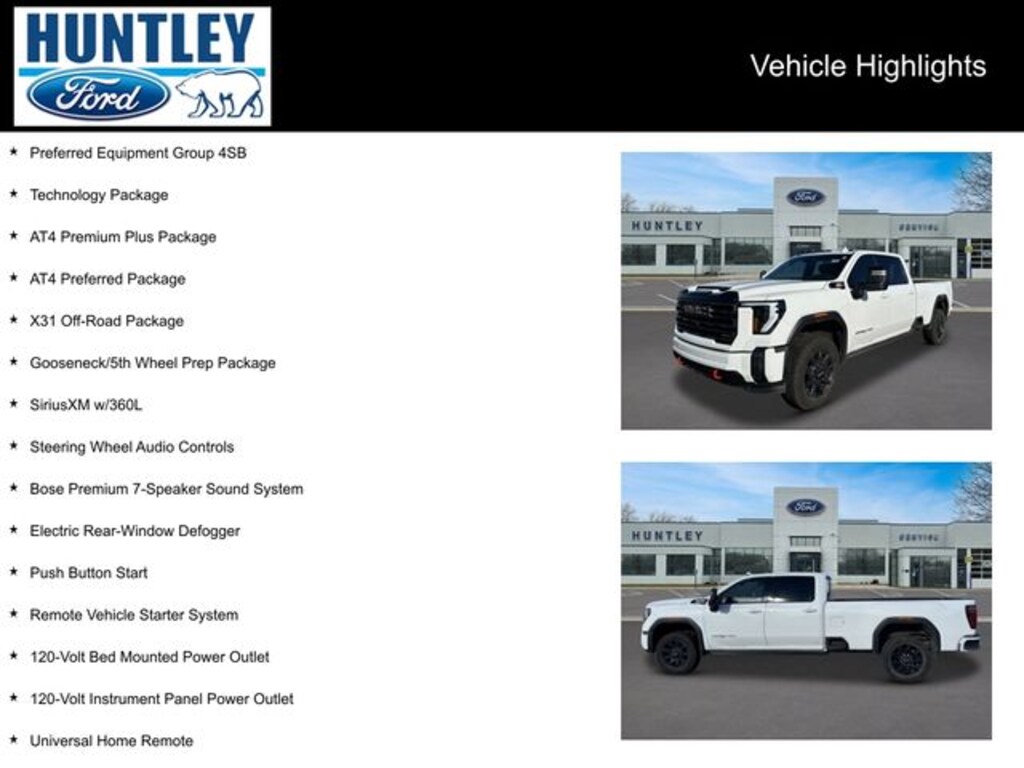 2024 GMC Sierra 2500HD 10-Speed Automatic, 4WD, Jet Black With Kalahari Accents Leather, 120-Volt Bed Mounted Power Outlet, 120-Volt Instrument Panel Power Outlet, 2 Charge-Only Rear USB Ports, 2 Charge/Data USB Ports Inside Center Console, 2 USB Ports, 2-Speed Active Transfer Case, 220-Amp Alternator, Adaptive Cruise Control, AT4 Preferred Package, AT4 Premium Plus Package, Bed View Camera w/2 Trailer Camera Provisions, Bose Premium 7-Speaker Sound System, Deep-Tinted Glass, Electric Rear-Window Defogger, Engine Block Heater, Exhaust Brake, Floor-Mounted Center Console, Front Prem Floor Liners w/Removable Carpet Insert, Front Rain-Sensing Wipers, Gloss Black Header Grille & Grille Insert Bars, GMC Connected Access Capable, Gooseneck/5th Wheel Prep Package, HD Surround Vision, Heated 2nd Row Outboard Seats, Heated Driver & Front Outboard Passenger Seats, Heavy-Duty 80 Amp Battery, High Idle Switch, Hill Descent Control, Inside Rearview Auto-Dimming Rear Camera Mirror, Integrated Trailer Brake Controller, Keyless Open & Start, LED Cargo Area Lighting, LED Smoked Amber Roof Marker Lamps, Manual Tilt-Wheel/Telescoping Steering Column, Multicolor 15" Diagonal Head-Up Display, Off-Road High Clearance Step (LPO), OnStar & GMC Connected Services Capable, Pickup Box, Power Front Passenger Windows w/Express Up/Down, Power Sliding Rear Window w/Defogger, Power Sunroof, Preferred Equipment Group 4SB, Push Button Start, Rear Cross Traffic Alert, Rear Prem Floor Liners w/Removable Carpet Insert, Rear Wheelhouse Liners, Remote Vehicle Starter System, Safety Alert Seat, SiriusXM w/360L, Spray-On Bedliner w/AT4 Logo, Steering Wheel Audio Controls, Technology Package, Trailer Cam Provisions & Trailer Viewing Software, Trailer Side Blind Zone Alert, Ultrasonic Front & Rear Park Assist, Unauthorized Entry Theft-Deterrent System, Universal Home Remote, Ventilated Driver & Front Passenger Seats, Wireless Charging, Wireless Phone Projection, X31 Off-Road Package. Clean CARFAX.