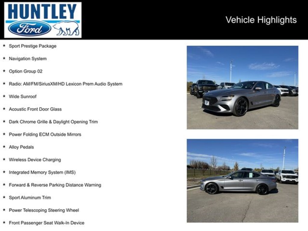 2023 Genesis G70 4-Way Power Lumbar Front Passenger Seat, Acoustic Front Door Glass, Alloy Pedals, Dark Chrome Grille & Daylight Opening Trim, Forward & Reverse Parking Distance Warning, Front Passenger Seat Walk-In Device, Integrated Memory System (IMS), Leather Seating Surfaces, Navigation System, Option Group 02, Power Folding ECM Outside Mirrors, Power Telescoping Steering Wheel, Radio: AM/FM/SiriusXM/HD Lexicon Prem Audio System, Rain-Sensing Wipers, Sport Aluminum Trim, Sport Prestige Package, Ventilated Front Seats, Wheels: 19" x 8.0J Fr & 19" x 8.5J Rr Sport Alloy, Wide Sunroof, Wireless Device Charging. CARFAX One-Owner.