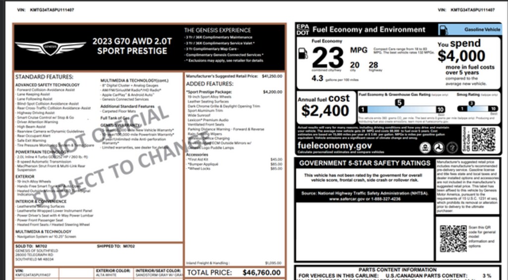 Recent Arrival! 2023 Genesis G70 8-Speed Automatic with SHIFTRONIC 4-Way Power Lumbar Front Passenger Seat, Acoustic Front Door Glass, Alloy Pedals, Dark Chrome Grille & Daylight Opening Trim, Forward & Reverse Parking Distance Warning, Front Passenger Seat Walk-In Device, Integrated Memory System (IMS), Leather Seating Surfaces, Option Group 02, Power Folding ECM Outside Mirrors, Power Telescoping Steering Wheel, Radio: AM/FM/SiriusXM/HD Lexicon Prem Audio System, Rain-Sensing Wipers, Sport Aluminum Trim, Sport Prestige Package, Ventilated Front Seats, Wheels: 19" x 8.0J Fr & 19" x 8.5J Rr Sport Alloy, Wide Sunroof, Wireless Device Charging. Clean CARFAX. CARFAX One-Owner. 20/28 City/Highway MPG I4