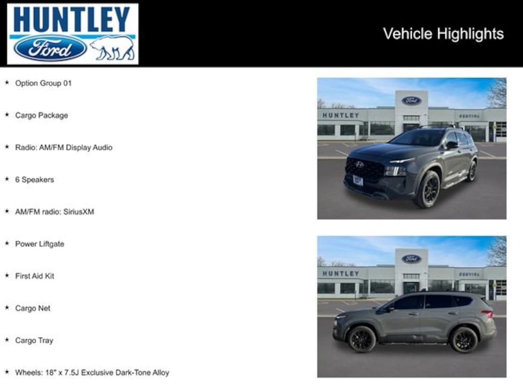 2022 Hyundai Santa Fe AWD, Black Cloth, 6 Speakers, AM/FM radio: SiriusXM, Cargo Net, Cargo Package, Cargo Tray, First Aid Kit, Option Group 01, Power Liftgate, Radio: AM/FM Display Audio, Wheels: 18" x 7.5J Exclusive Dark-Tone Alloy.