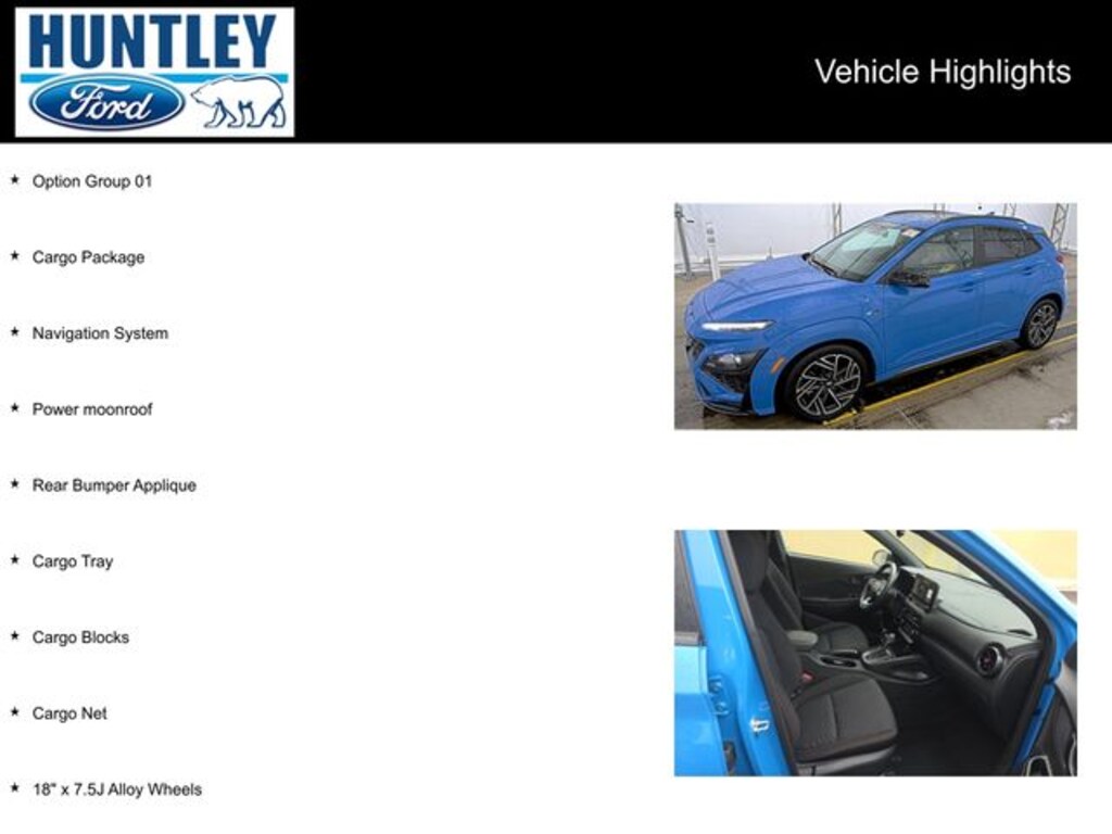 2023 Hyundai Kona 18" x 7.5J Alloy Wheels, Cargo Blocks, Cargo Net, Cargo Package, Cargo Tray, Navigation System, Option Group 01, Power moonroof, Rear Bumper Applique. Clean CARFAX. CARFAX One-Owner.
