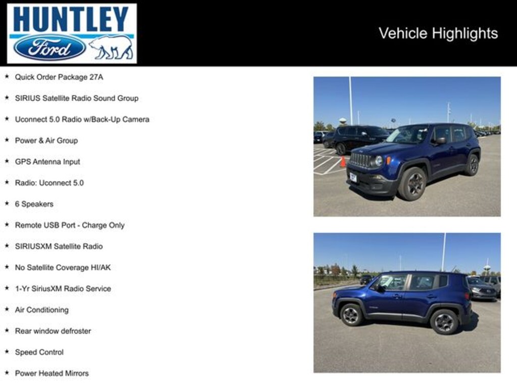 2016 Jeep Renegade 1-Yr SiriusXM Radio Service, 5.0" Touchscreen Display, 6 Speakers, Air Conditioning, Exterior Mirrors w/Heating Element, For More Info Call 800-643-2112, GPS Antenna Input, Integrated Voice Command w/Bluetooth, No Satellite Coverage HI/AK, ParkView Rear Back Up-Camera, Power & Air Group, Power Heated Mirrors, Quick Order Package 27A, Radio: Uconnect 5.0, Rear window defroster, Remote USB Port - Charge Only, SIRIUS Satellite Radio Sound Group, SIRIUSXM Satellite Radio, Speed Control, Uconnect 5.0 Radio w/Back-Up Camera.