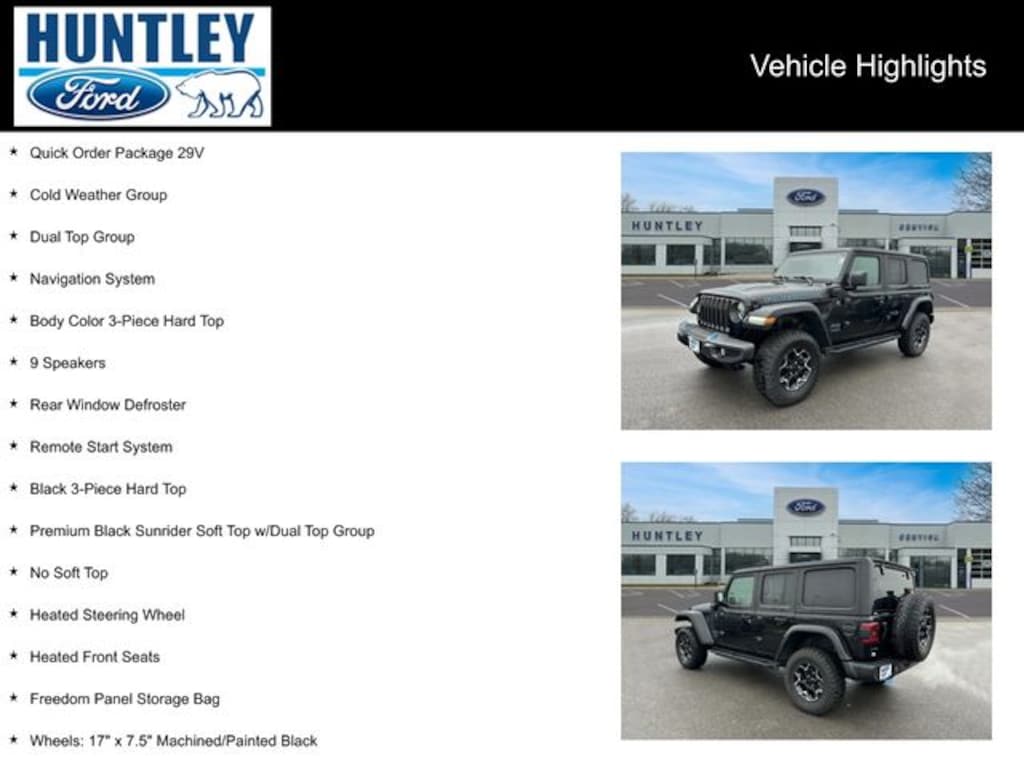 2021 Jeep Wrangler 2.0L I4 DOHC, 9 Speakers, Black 3-Piece Hard Top, Body Color 3-Piece Hard Top, Cold Weather Group, Dual Top Group, Freedom Panel Storage Bag, Heated Front Seats, Heated Steering Wheel, Navigation System, No Soft Top, Premium Black Sunrider Soft Top w/Dual Top Group, Quick Order Package 29V, Rear Window Defroster, Rear Window Wiper/Washer, Remote Start System, Wheels: 17" x 7.5" Machined/Painted Black.