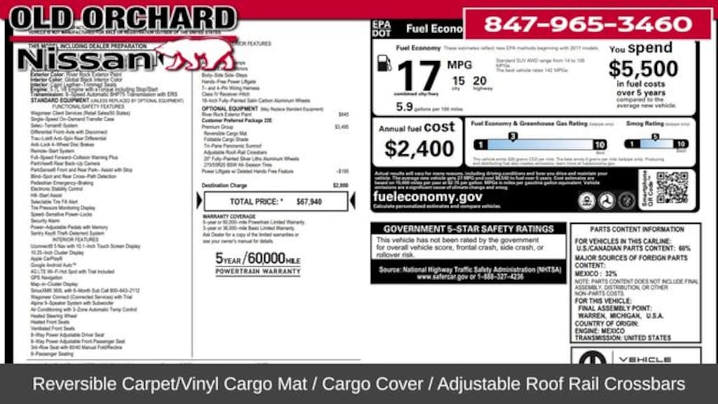 Plus Tax, Title, License and Doc Fee To qualified buyers with approved credit only. 0% APR for 72 months on new Nissans. Max 10k financed. $13.89 per thousand financed. Must qualify and finance with captive lender to receive all incentives and rebates. See dealer for details. Although every reasonable effort has been made to ensure the accuracy of the information contained in this site, absolute accuracy cannot be guaranteed. This site and all the information and materials appearing on it, are presented to the user "as is" without a warranty of any kind, either expressed or implied. All vehicles are subject to prior sales. Vehicles shown at different locations are not currently in our inventory but can be made available to you at our location within a reasonable date form the time of your request, not to exceed one week. Old Orchard Nissan serves customers 350 miles or closer. See Dealer for Details.