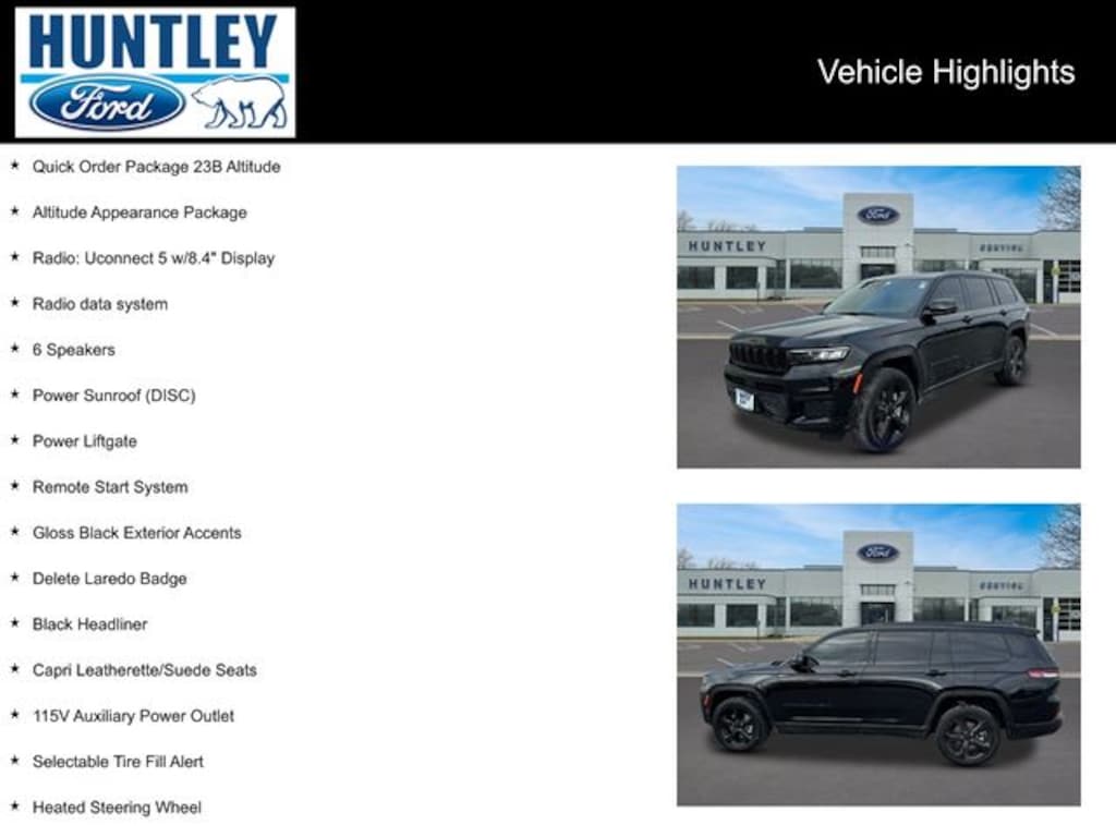 2023 Jeep Grand Cherokee L 115V Auxiliary Power Outlet, 3rd Row Charge-Only USB Ports, 6 Speakers, Altitude Appearance Package, Black Headliner, Capri Leatherette/Suede Seats, Delete Laredo Badge, Gloss Black Exterior Accents, Heated Front Seats, Heated Steering Wheel, Molded In Color Black/Gloss Black Roof Rails, Power Liftgate, Power Sunroof (DISC), Quick Order Package 23B Altitude, Radio data system, Radio: Uconnect 5 w/8.4" Display, Rain Sensitive Windshield Wipers, Remote Start System, Selectable Tire Fill Alert, Wheels: 18" x 8.0" Fully Painted Aluminum 1, Wireless Charging Pad. CARFAX One-Owner.
