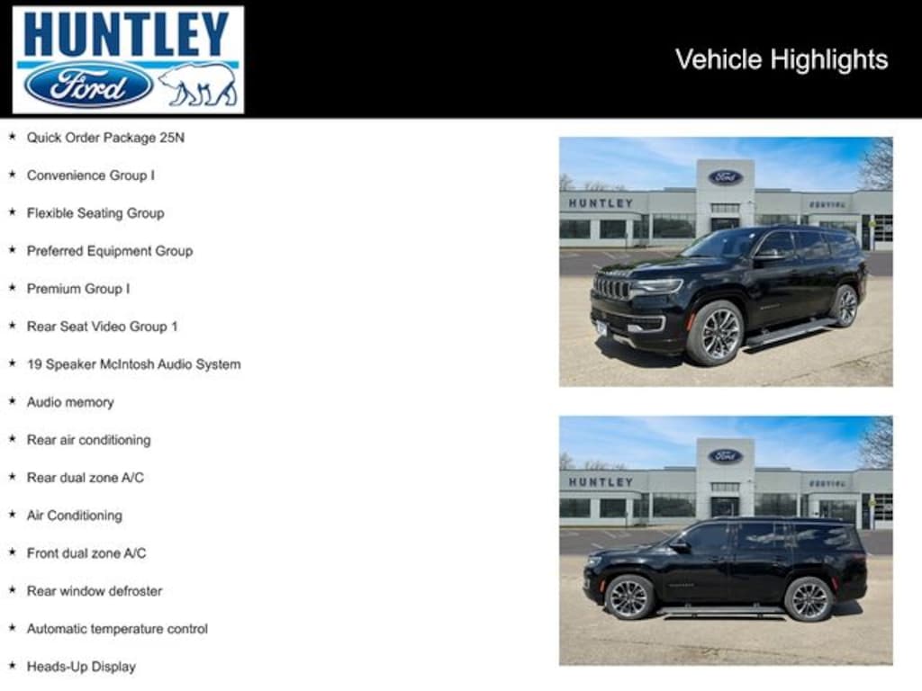 2023 Jeep Wagoneer 19 Speaker McIntosh Audio System, 2nd Row Manual Window Shades, 3 Panel Sunroof, 60/40 Power Recline 3rd Row Seat, 7-Passenger Seating, Adjustable Roof Rail Crossbars, Air Conditioning, Amazon Fire TV Built-In, Audio memory, Auto-leveling suspension, Automatic temperature control, Cargo Cover, Convenience Group I, Drowsy Driver Detection, Flexible Seating Group, Floor Console w/Cupholder, Front dual zone A/C, Heads-Up Display, Intersection Collision Assist System, Luxury Front & Rear Floor Mats, Memory seat, P&P Park & Unpark Assist w/Stop System, Pedal memory, Power Deployable Running Boards, Power driver seat, Power Liftgate, Power steering, Power Tip/Slide Recline 2nd Row Buckets, Power windows, Preferred Equipment Group, Premium Group I, Quadra-Lift Air Suspension, Quick Order Package 25N, Rear air conditioning, Rear dual zone A/C, Rear Seat Video Group 1, Rear window defroster, Remote keyless entry, Reversible Carpet/Vinyl Cargo Mat, Seatback Video Screens, Semi Active Damping, Side Distance Warning, Steering wheel memory, Steering wheel mounted audio controls, Surround View Camera System, Traffic Sign Recognition, Video USB Port, Wheels: 22" x 9.0" Premium 3 Aluminum.