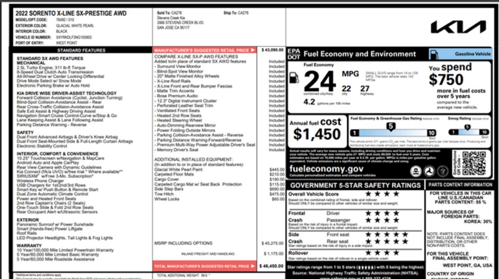 I got the 2022 Sorento for myself after we bought a 2021 Telluride for my wife. Our Sorento is the SX-Prestige, AWD X-Line version. I love the safety features -active lane keeping assist, adaptive cruise control, active assist braking, collision monitoring and more- and the 360 degree cameras are a great feature when getting in or out of tight spaces. The 2.5L turbo is very impressive, with lots of power and torque, and the handling is fantastic, especially around corners at fast speed. This feels more solid on cornering than the 2018 Tiguan I had, which was much lower to the ground. The mileage is good for an AWD, at 22 city and 27 highway. The cargo space is great, especially if you drop the third row -very easy- which allows for tons of shopping/grocery bags or luggage. I love the design, as well, which takes many cues from the bigger Telluride. The 100,000 mile limited powertrain warranty gives me comfort, as does the bumper to bumper 60k warranty. My previous Ford Escape was half that for bumper to bumper, and only 60k for powertrain, and the transmissionAND the turbo both went out at 60k. Scary! Kia has been on a great streak with quality and design. Can't wait to see how these perform over the years, but my confidence is high. The 2022 Sorento has memory seats, which was missing from the 2021 model and is a great feature when you have multiple drivers. There are some things the Sorento lacks that the Telluride has, and which are available in other countries but not on a North American Sorento. The most notable is the heads-up display, which I find to be a great safety feature on the Telluride. Blind spot monitoring, distance to the car in front, speed, they're all displayed in the heads-up unit -but not available on North American Sorentos. Also missing are hood struts -you have to use a manual prop to hold the hood open, despite hood struts being on Sorentos in other markets. Who knows, maybe they had to trim weight for mileage regulations.…