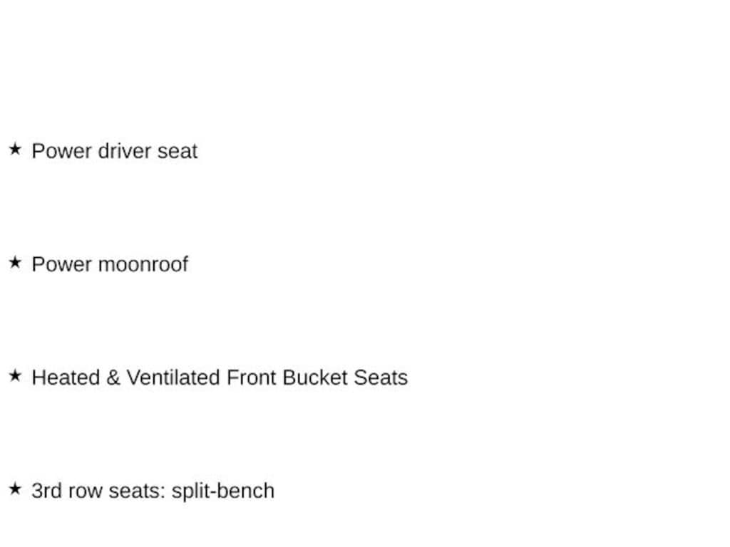 Overall an excellent vehicle. Minor annoyances are the fact that a garage door opener is only standard on the highest trim. Digital Instrument display is a little cheap looking and not very user friendly or informative. Other than that, it's a comfortable ride with a bunch of room. Has built in sunshades in the rear doors which is nice to have. USB ports everywhere even in the 3rd row.… - 5.0