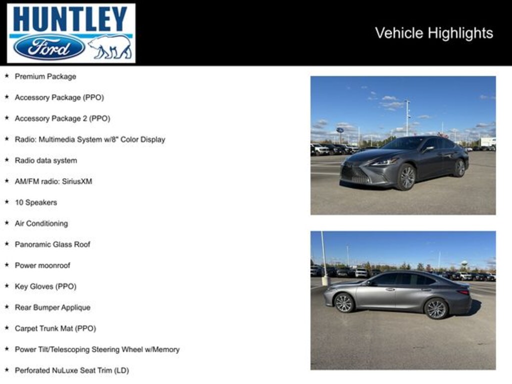 2021 Lexus ES 10 Speakers, Accessory Package (PPO), Accessory Package 2 (PPO), Air Conditioning, Alloy Wheel Locks, Alloy wheels, AM/FM radio: SiriusXM, Cargo Net (PPO), Carpet Trunk Mat (PPO), Heated & Ventilated Seats, Key Gloves (PPO), Panoramic Glass Roof, Perforated NuLuxe Seat Trim (LD), Power moonroof, Power Tilt/Telescoping Steering Wheel w/Memory, Premium Package, Radio data system, Radio: Multimedia System w/8" Color Display, Rain Sensing Wipers, Rear Bumper Applique, Wheels: 18" x 8J Split 10-Spoke High Gloss. Clean CARFAX.