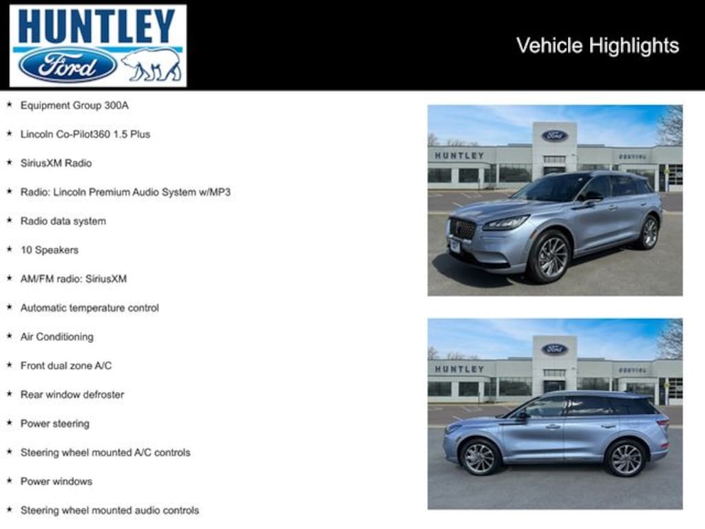2022 Lincoln Corsair 2.5L i-VCT, 10 Speakers, 19" Bright Machined Aluminum Wheels, 360-Degree Camera w/Front & Rear Camera Washer, Active Park Assist 2.0, Air Conditioning, AM/FM radio: SiriusXM, Automatic temperature control, Equipment Group 300A, Evasive Steering Assist (ESA), Front dual zone A/C, Front/Side/Rear Parking Sensors, Intelligent Adaptive Cruise Control, Lincoln Co-Pilot360 1.5 Plus, Power driver seat, Power Liftgate, Power moonroof: Panoramic Vista Roof, Power steering, Power windows, Radio data system, Radio: Lincoln Premium Audio System w/MP3, Rear window defroster, Remote keyless entry, Reverse Brake Assist, SiriusXM Radio, Steering wheel memory, Steering wheel mounted A/C controls, Steering wheel mounted audio controls, SYNC 3 Communications & Entertainment System. Clean CARFAX. CARFAX One-Owner.