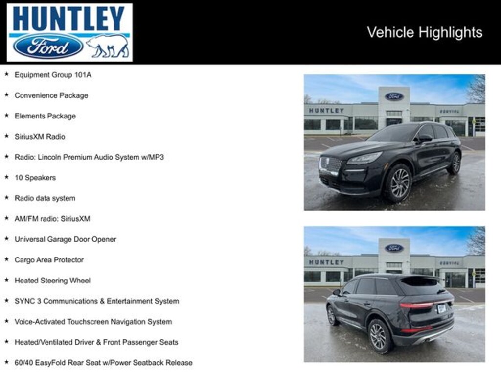 2022 Lincoln Corsair 10 Speakers, 18" Bright Machined Aluminum Wheels, 60/40 EasyFold Rear Seat w/Power Seatback Release, AM/FM radio: SiriusXM, Cargo Area Protector, Convenience Package, Elements Package, Equipment Group 101A, Heated Rear Seat, Heated Steering Wheel, Heated/Ventilated Driver & Front Passenger Seats, Radio data system, Radio: Lincoln Premium Audio System w/MP3, Rain Sensing Wipers, SiriusXM Radio, SYNC 3 Communications & Entertainment System, Universal Garage Door Opener, Voice-Activated Touchscreen Navigation System, Windshield Wiper De-Icer.