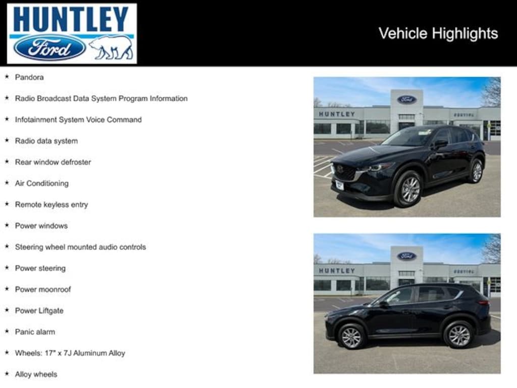 2023 Mazda CX-5 Air Conditioning, Alloy wheels, Infotainment System Voice Command, Pandora, Panic alarm, Power Liftgate, Power moonroof, Power steering, Power windows, Radio Broadcast Data System Program Information, Radio data system, Rain sensing wipers, Rear window defroster, Rear window wiper, Remote keyless entry, Steering wheel mounted audio controls, Variably intermittent wipers, Wheels: 17" x 7J Aluminum Alloy. Clean CARFAX. CARFAX One-Owner.