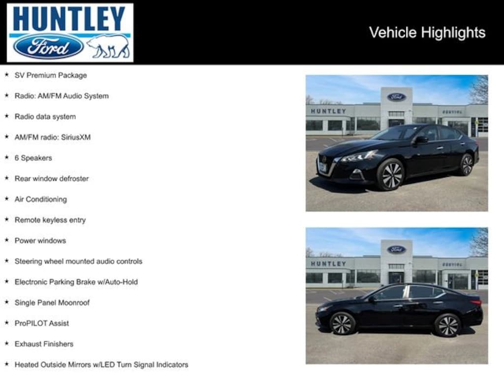 2022 Nissan Altima CVT with Xtronic, 17" Machined Alloy Wheels, 6 Speakers, Air Conditioning, AM/FM radio: SiriusXM, Electronic Parking Brake w/Auto-Hold, Exhaust Finishers, Heated Front Seats, Heated Outside Mirrors w/LED Turn Signal Indicators, Intelligent Lane Intervention (I-LI), Leather Shift Knob, Leather Steering Wheel, Power windows, ProPILOT Assist, Radio data system, Radio: AM/FM Audio System, Rear window defroster, Remote keyless entry, Single Panel Moonroof, Steering wheel mounted audio controls, SV Premium Package. CARFAX One-Owner.
