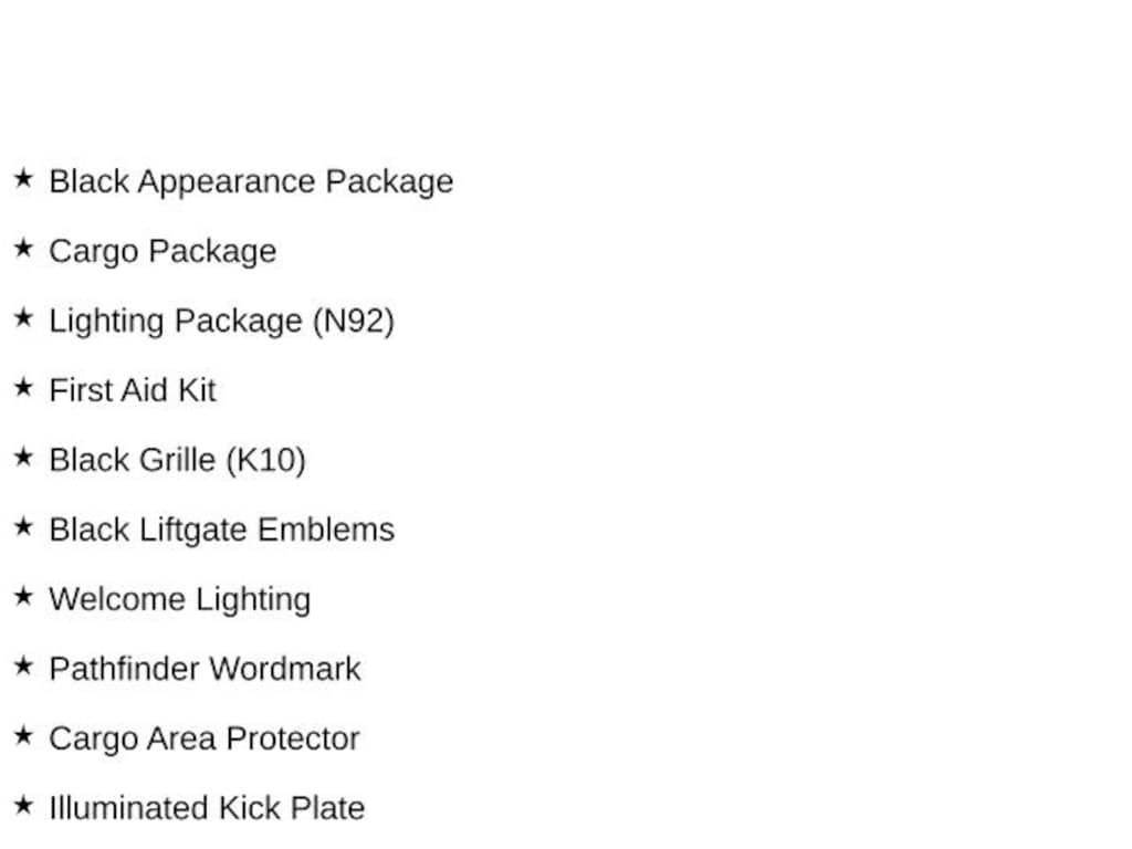 2023 Nissan Pathfinder 9-Speed Automatic 4WD, Black Appearance Package, Black Grille (K10), Black Liftgate Emblems, Cargo Area Protector, Cargo Net, Cargo Package, First Aid Kit, Illuminated Kick Plate, Lighting Package (N92), Pathfinder Wordmark, Welcome Lighting. Clean CARFAX. CARFAX One-Owner. V6 Odometer is 9045 miles below market average!