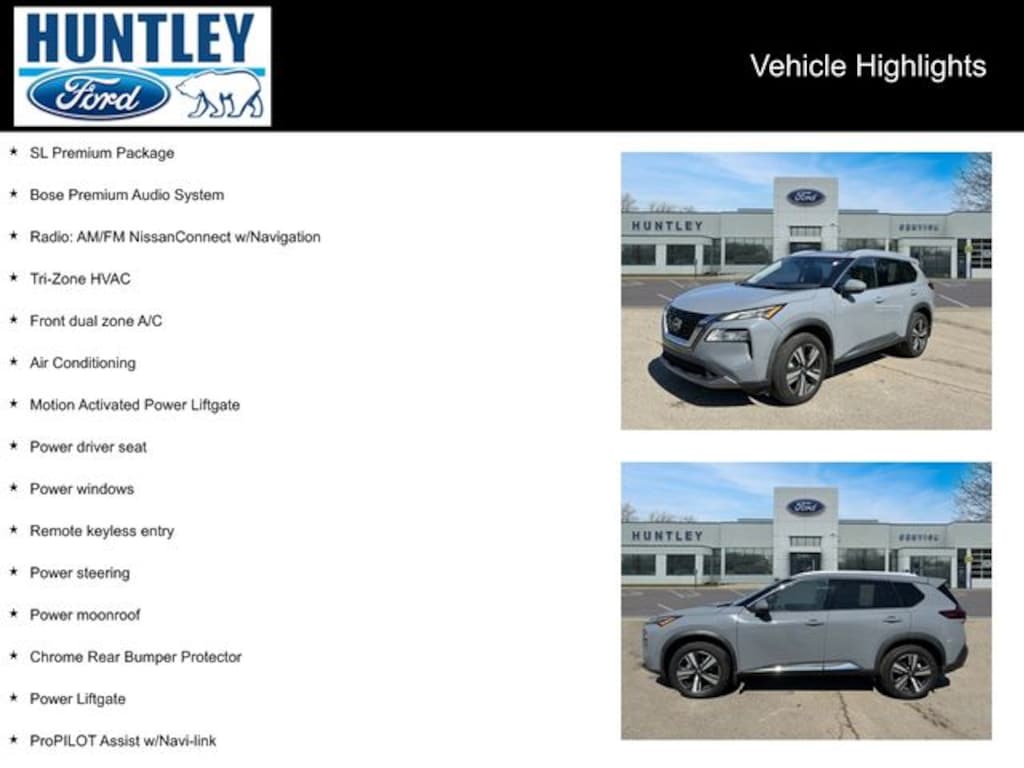 2023 Nissan Rogue 19" Aluminum Alloy Wheels, Air Conditioning, Bose Premium Audio System, Chrome Rear Bumper Protector, Front dual zone A/C, Front, Side & Rear Sonar, Motion Activated Power Liftgate, Power driver seat, Power Liftgate, Power moonroof, Power steering, Power windows, ProPILOT Assist w/Navi-link, Radio: AM/FM NissanConnect w/Navigation, Rear Door Sunshades, Remote keyless entry, SL Premium Package, Traffic Sign Recognition, Tri-Zone HVAC. CARFAX One-Owner.