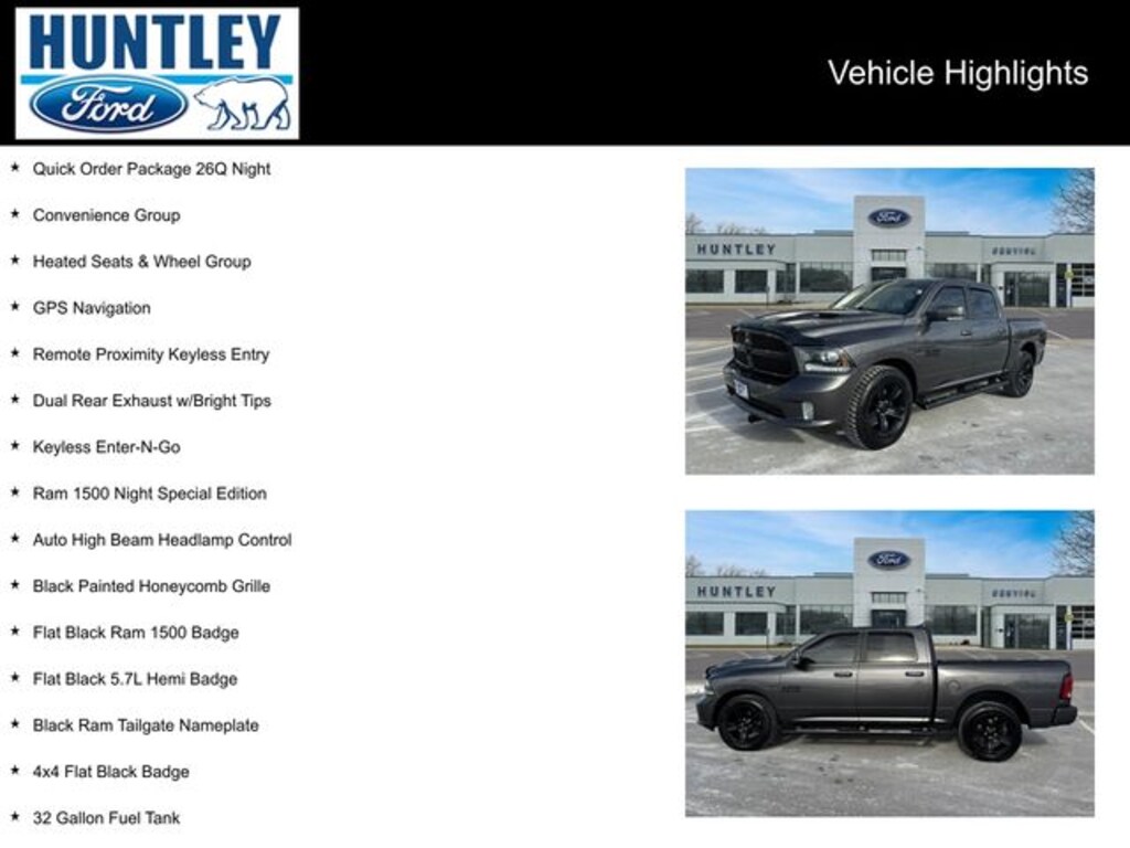 2017 Ram 1500 32 Gallon Fuel Tank, 4x4 Flat Black Badge, Auto High Beam Headlamp Control, Black Painted Honeycomb Grille, Black Ram Tailgate Nameplate, Center Hub, Convenience Group, Dual Rear Exhaust w/Bright Tips, Flat Black 5.7L Hemi Badge, Flat Black Ram 1500 Badge, GPS Navigation, Heated Seats & Wheel Group, Keyless Enter-N-Go, Quick Order Package 26Q Night, Rain Sensitive Windshield Wipers, Ram 1500 Night Special Edition, Remote Proximity Keyless Entry, Wheels: 20" x 9" Semi-Gloss Black Aluminum.