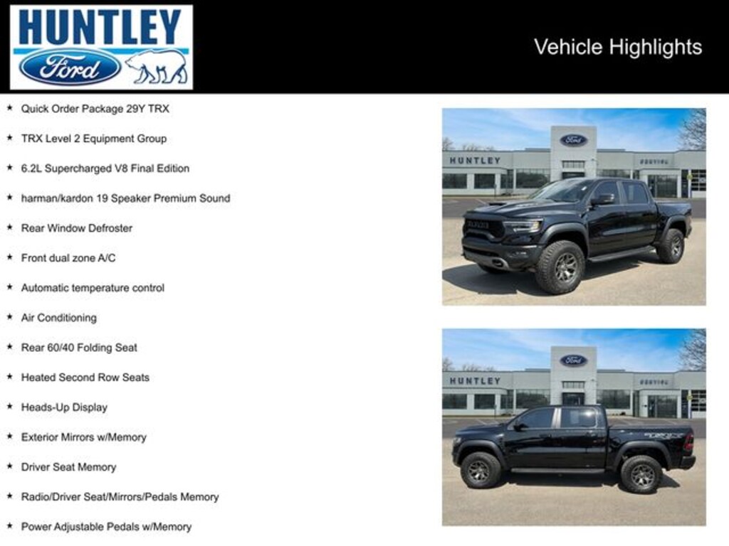 2024 Ram 1500 #2 Seat Foam Cushion, 2-Door Passive Entry, Front Door Locks, 4 Way Front Headrests, 6.2L Supercharged V8 Final Edition, Accent Color Door Handles, Adaptive Cruise Control w/Stop & Go, Air Conditioning, Automatic temperature control, Blind Spot & Cross Path Detection, Bucket Seats, Digital Rearview Mirror, Dome Dual LED Reading Lamp, Driver Seat Memory, Driver/Passenger Wrapped Assist Handles, Dual-Pane Panoramic Sunroof, Exterior Mirrors w/Memory, Front Door Accent Lighting, Front dual zone A/C, Front Seat Back Map Pockets, Full Length Premium Upgraded Floor Console, harman/kardon 19 Speaker Premium Sound, Heads-Up Display, Heated Front Seats, Heated Second Row Seats, Heated Steering Wheel, IP LED Ambient Light Pipe, Lane Keep Assist, Leather Trimmed Bucket Seats, Leather/Carbon Flat-Bottom Steering Wheel, Leather/Suede Flat-Bottom Steering Wheel, LED CHMSL Lamp, Luxury Front Door Trim Panel, MOPAR 4 Adjustable Cargo Tie-Down Hooks, MOPAR Bright Pedal Kit, MOPAR Deployable Bed Step, MOPAR Off-Road Style Running Boards, MOPAR Spray In Bedliner, MOPAR TRX Hood Graphics, ParkSense Front/Rear Park Assist w/Stop, Patina Accent Stitching, Pedestrian Emergency Braking, Pick-Up Box Lighting, Power 4-Way Driver Lumbar Adjust, Power 4-Way Passenger Lumbar Adjust, Power 8-Way Driver & Passenger Seats, Power Adjustable Pedals w/Memory, Power driver seat, Power steering, Power windows, Premium Wrapped IP Bezel, Quick Order Package 29Y TRX, Radio/Driver Seat/Mirrors/Pedals Memory, Rain Sensitive Windshield Wipers, Real Carbon Fiber Interior Accents, Rear 60/40 Folding Seat, Rear 60/40 Folding Split Recline Seat, Rear Door Accent Lighting, Rear Underseat Compartment Storage, Rear Window Defroster, Remote keyless entry, Remote Tailgate Release, Special Edition Console Badge, Special Edition Hood Badge, Steering wheel mounted audio controls, Sun Visors w/Illuminated Vanity Mirrors, Surround View Camera System, Trailer Brake Control, Trailer Light Check, Trailer Reverse Steering Control, Trailer Tire Pressure Monitoring System, TRX Level 2 Equipment Group, TRX Special Edition Side Graphics, Universal Garage Door Opener, Ventilated Front Seats, Ventilated Rear Seats, Wheels: 18" x 9" Bead Lock Aluminum, Wireless Charging Pad.