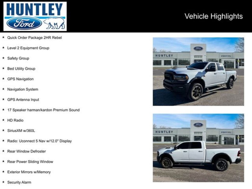 2024 Ram 2500 12" Touchscreen Display, 17 Speaker harman/kardon Premium Sound, 220 Amp Alternator, 2nd Row In Floor Storage Bins, 4G LTE Wi-Fi Hot Spot, 4x4 Badge, Adaptive Cruise Control w/Stop, Adaptive Steering System, Alexa Built-In, Aluminum Litho Instrument Panel Bezels w/Blk Trim, Apple CarPlay, Auto Adjust In Reverse Exterior Mirrors, Auto Dim Exterior Mirror, Auto High Beam Headlamp Control, Auto Power-Folding Mirrors, Auto-Dimming Exterior Passenger Mirror, Bed Utility Group, Bi-Function LED Projector Headlamps, Black Exterior Mirrors, Black Rotary Shifter w/Silver Stripe, Blind Spot & Cross Path Detection, Body Color Door Handles, Connected Travel & Traffic Services, Connectivity - US/Canada, Conventional Differential Front Axle, Disassociated Touchscreen Display, Electric Shift-On-The-Fly Transfer Case, Exterior Mirrors Courtesy Lamps, Exterior Mirrors w/Heating Element, Exterior Mirrors w/Memory, Exterior Mirrors w/Supplemental Signals, For Details, Visit DriveUconnect.com, For More Info, Call 800-643-2112, Forward & Reverse Utility Lights, Front Door Accent Lighting, Full Speed Forward Collision Warning Plus, Global Telematics Box Module (TBM), Google Android Auto, GPS Antenna Input, GPS Navigation, HD Radio, Instrument Cluster Theme 2 - Rebel, Integrated Voice Command w/Bluetooth, Lane Keep Assist, Leather Wrapped Grab Handle, LED Bed Lighting, LED Dome Lamp w/On/Off Switch, LED Interior Lighting, Level 2 Equipment Group, Limited Slip Rear Differential w/Electronic Lock, Luxury Door Trim Panel (CTH), Mirror Running Lights, MOPAR Deployable Bed Step, MOPAR Front & Rear Rubber Floor Mats, MOPAR Spray In Bedliner, Navigation System, Off-Road Information Pages, Overhead LED Lamps, Painted Semi-Texture Film Instrument Panel Bezels, Power Adjust Mirrors, Power Adjustable Convex Aux Mirrors, Power Adjustable Pedals w/Memory, Power Heated Fold Telescopic Mirrors w/Memory, Power Sunroof, Power Telescoping Mirrors, Premium Overhead Console, Quick Order Package 2HR Rebel, Radio: Uconnect 5 Nav w/12.0" Display, Rain Sensitive Windshield Wipers, Rear Door Accent Lighting, Rear Power Sliding Window, Rear Window Defroster, Rebel Badge, Rebel Instrument Panel Badge, Rebel Suspension, Remote Proximity Keyless Entry, Safety Group, Security Alarm, Selectable Tire Fill Alert, SiriusXM Radio Service, SiriusXM w/360L, Sport Performance Hood, Sun Visors w/Illuminated Vanity Mirrors, Trailer Tow Pages, Universal Garage Door Opener, Wheels: 20" x 8.0" Black Diamond Cut Aluminum. Clean CARFAX. CARFAX One-Owner.